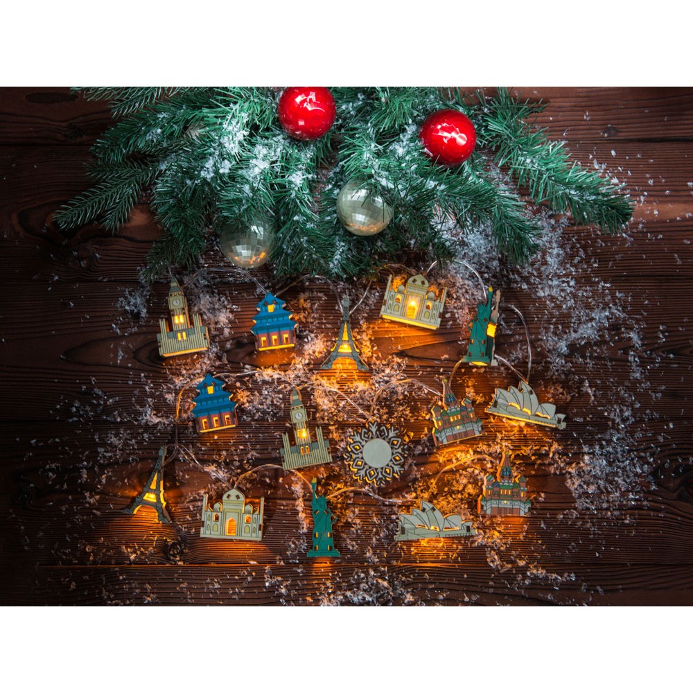 Новогодняя ёлочная гирлянда постоянного свечения с цветными фигурками достопримечательностей из натуральной березовой фанеры сделает процесс украшения ёлки или дома не только увлекательным, но и познавательным!
