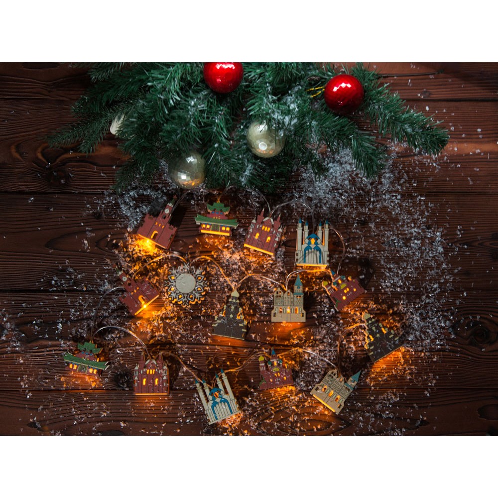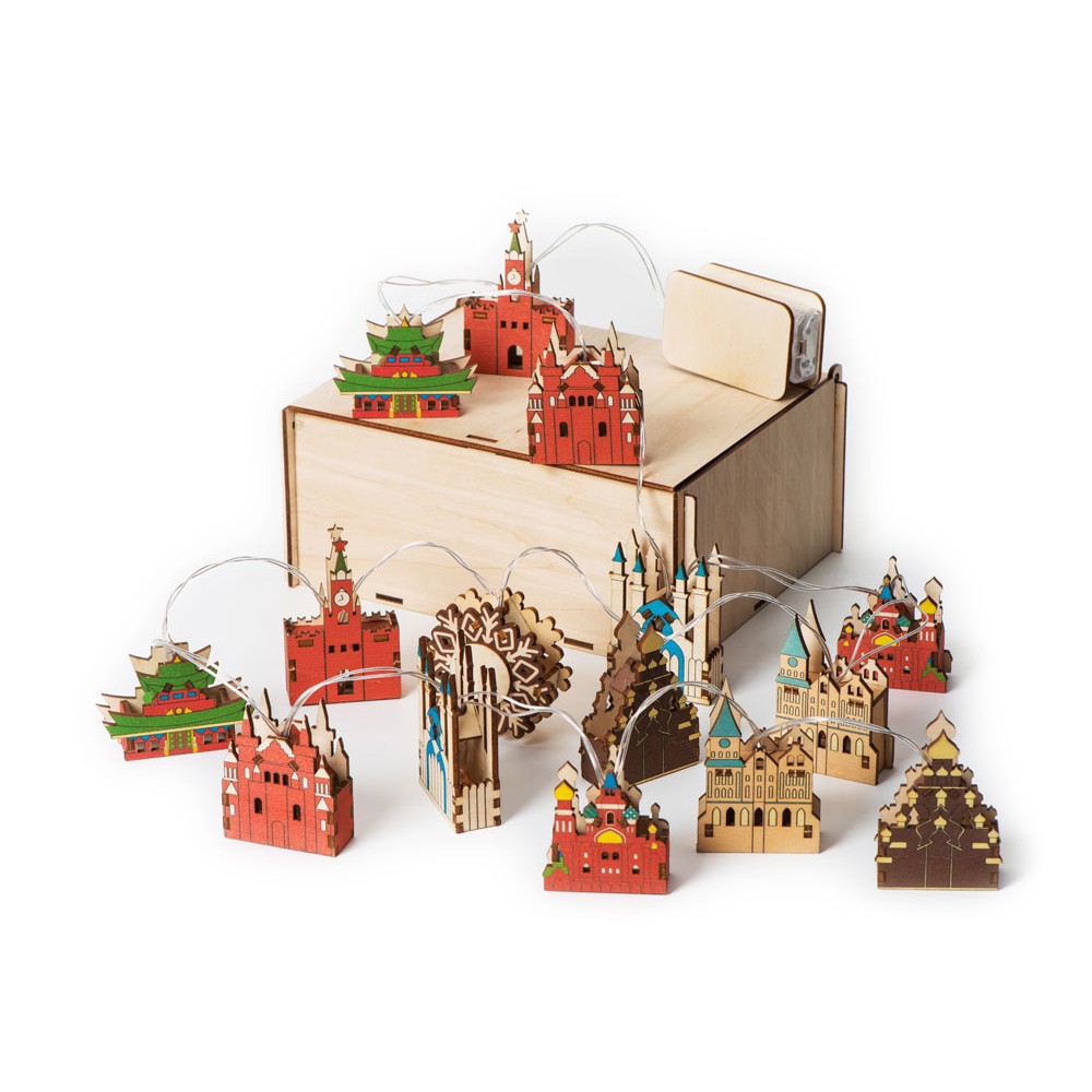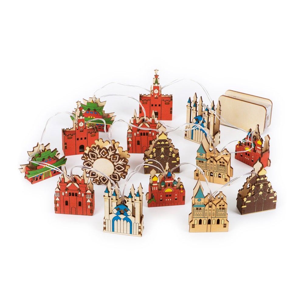 Новогодняя ёлочная гирлянда постоянного свечения с цветными фигурками достопримечательностей из натуральной березовой фанеры сделает процесс украшения ёлки или дома не только увлекательным, но и познавательным!