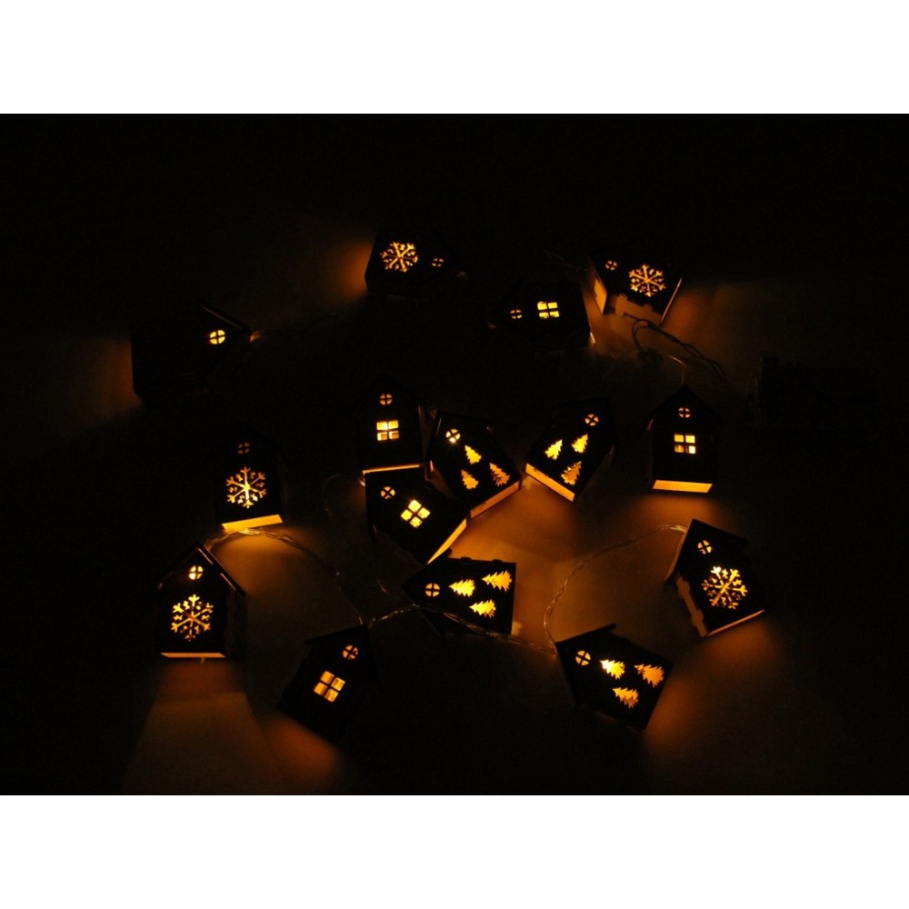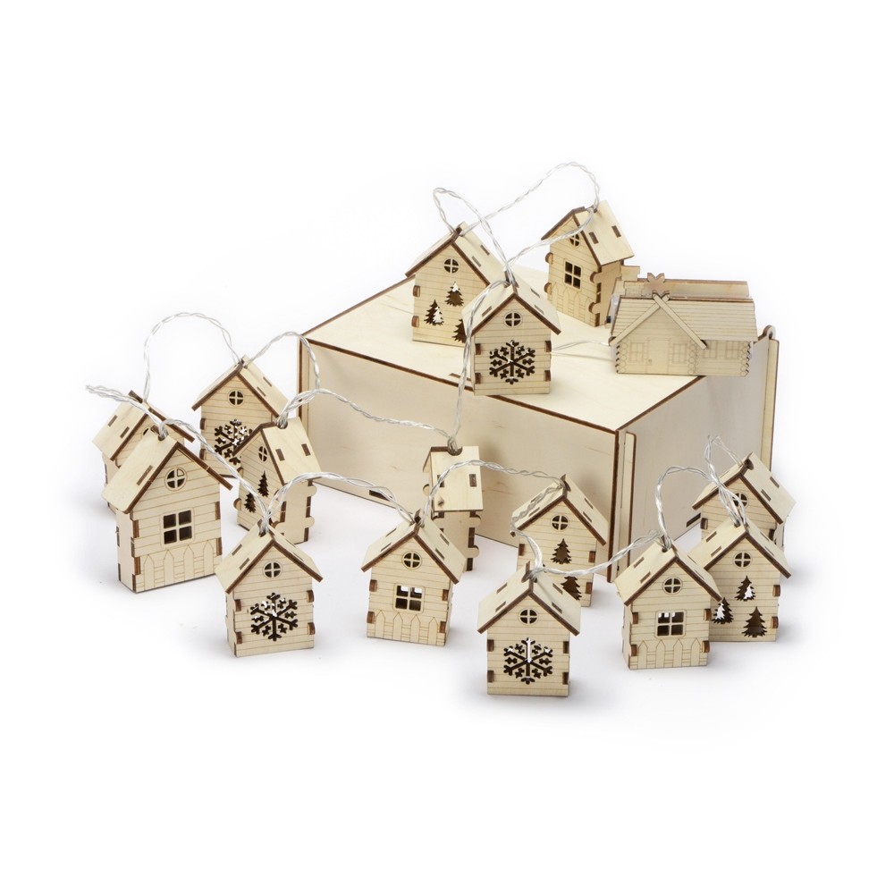 Светодиодная новогодняя елочная гирлянда постоянного свечения с домиками из натуральной березовой фанеры. Работает от 2-х батареек АА (в комплекте). Упакована в деревянную подарочную коробку со стружкой.