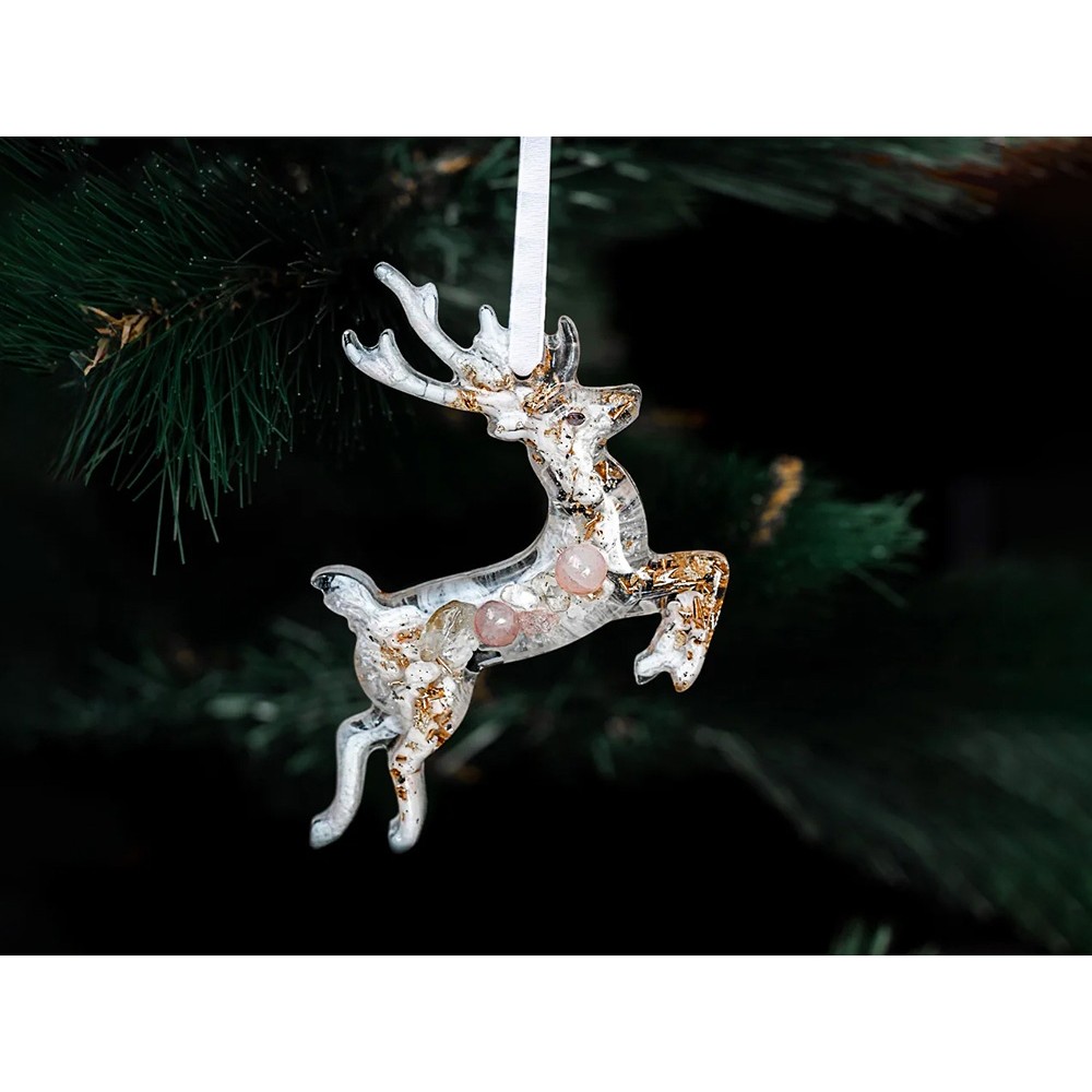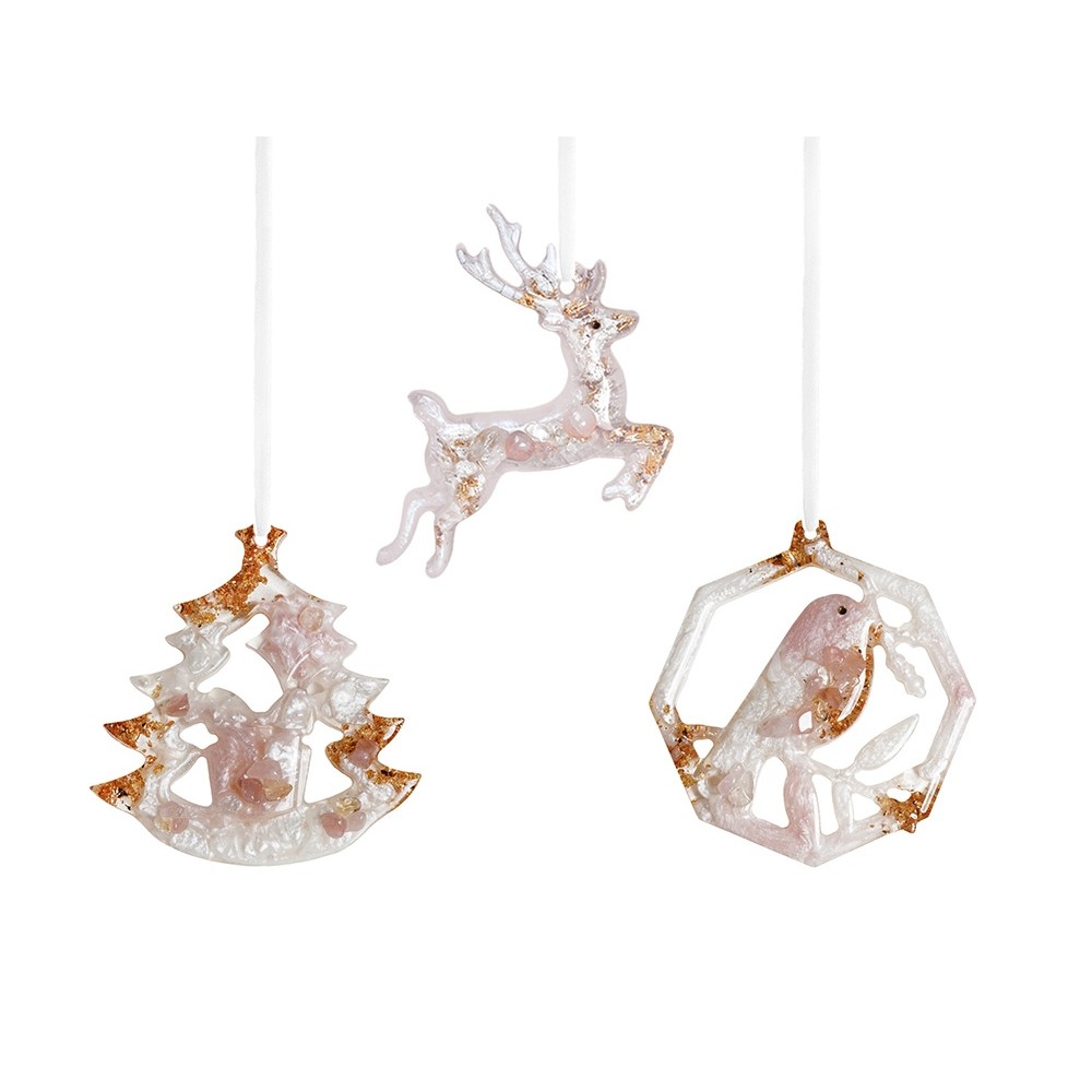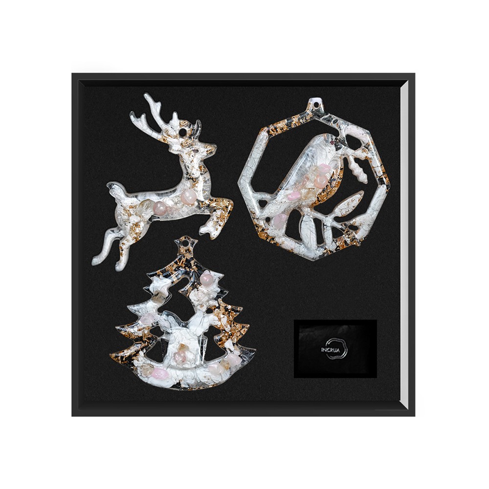 Набор из 3-х елочных игрушек: в форме оленя, снегиря и елки. Игрушки выполнены из ювелирной эпоксидной смолы и украшены галтовкой из натуральных минералов.