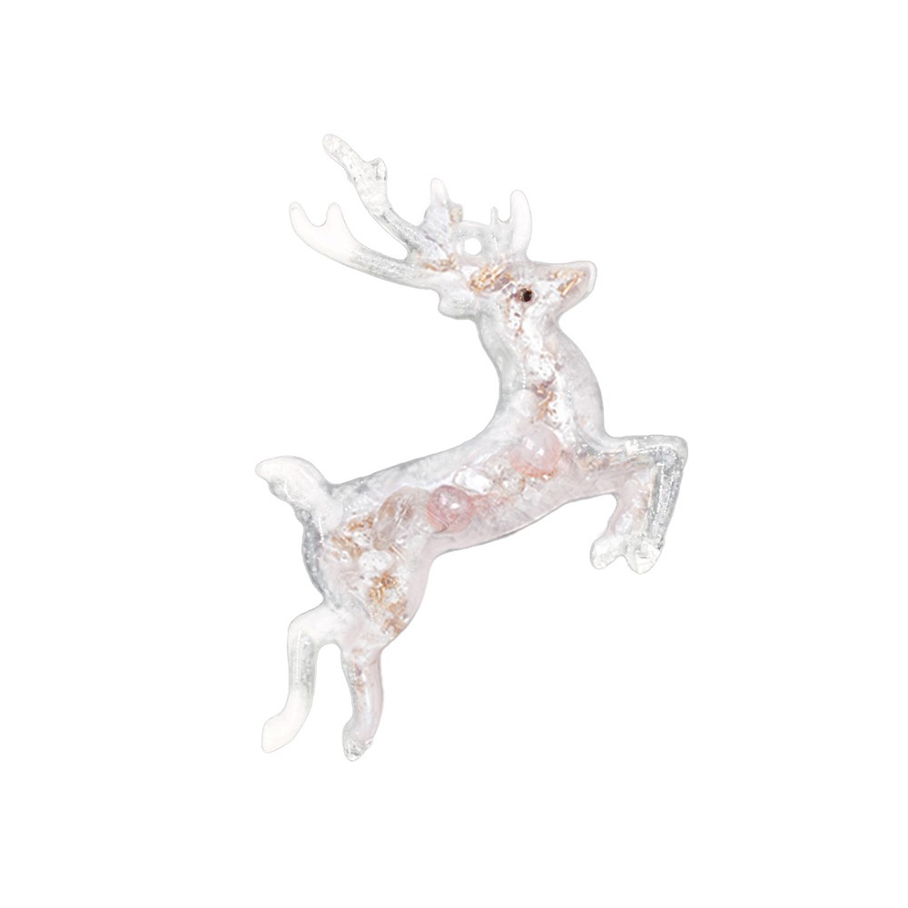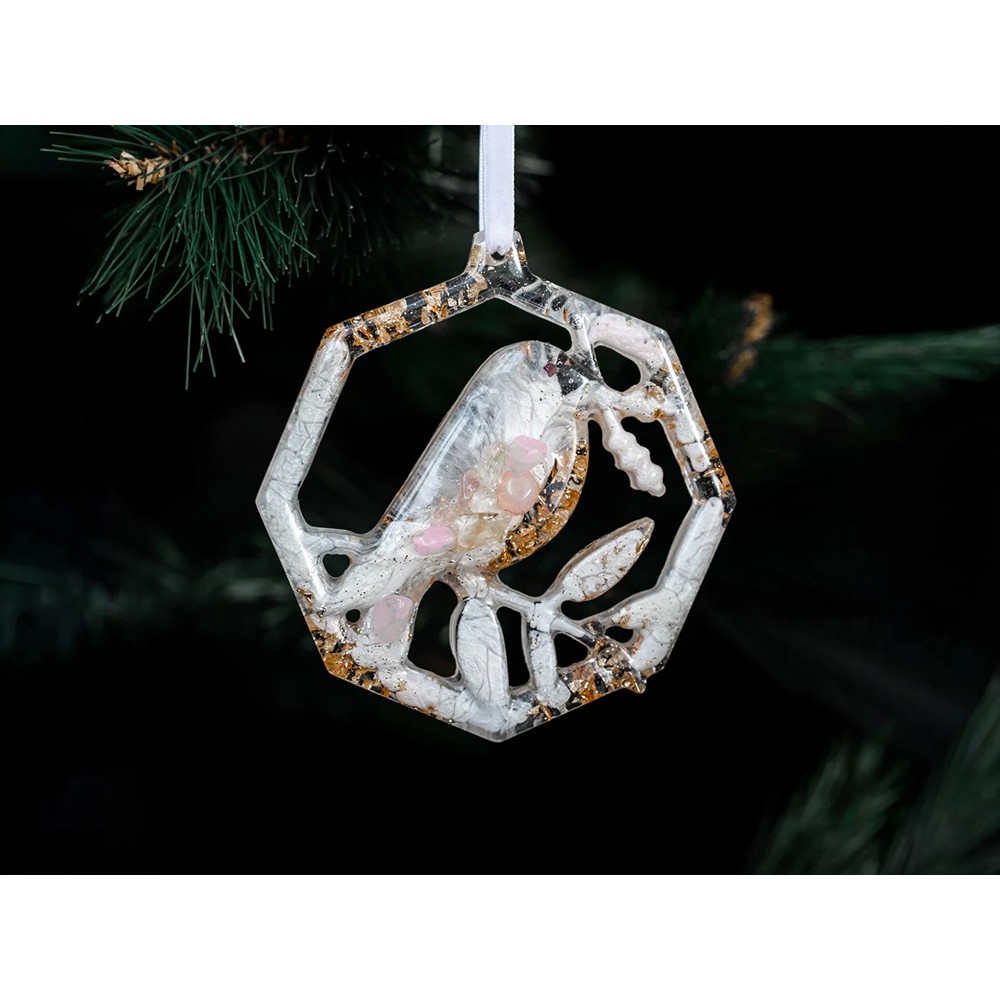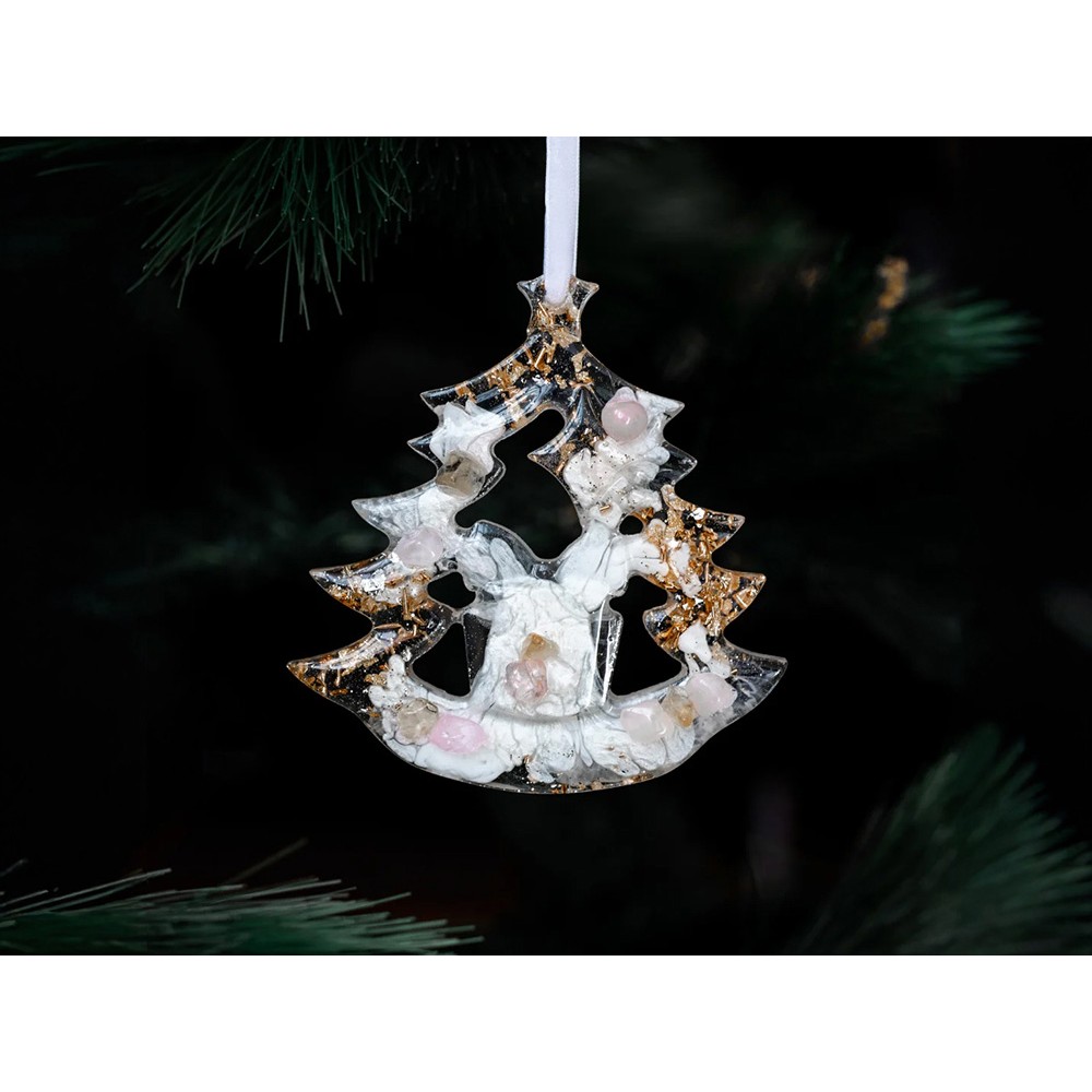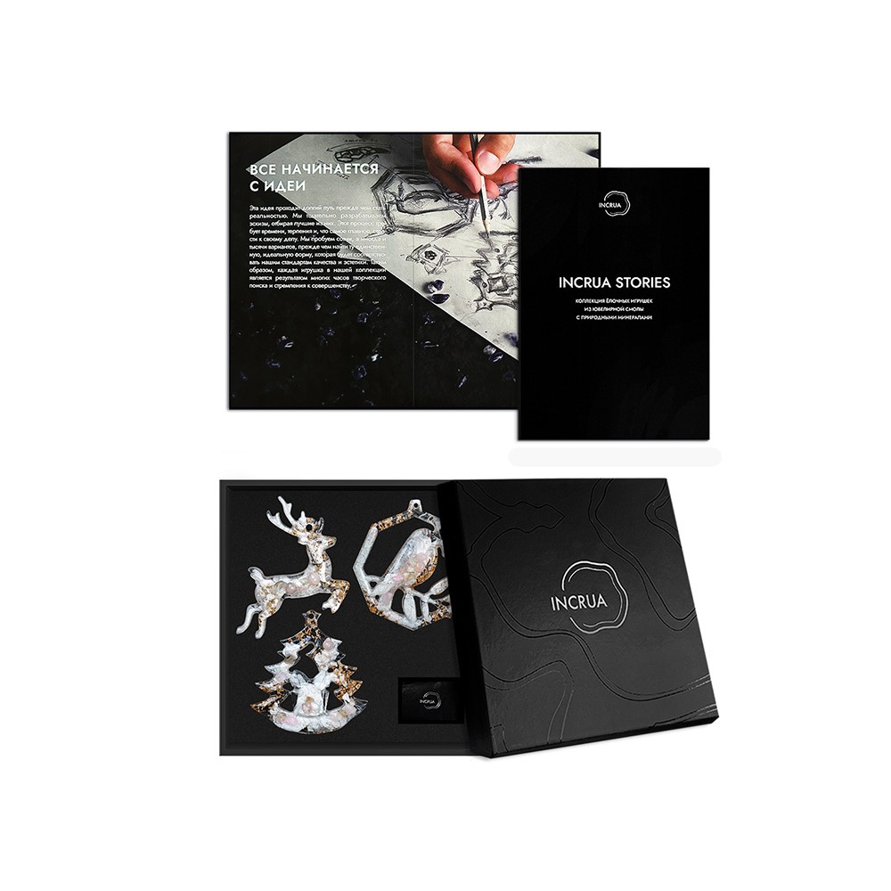 Набор из 3-х елочных игрушек: в форме оленя, снегиря и елки. Игрушки выполнены из ювелирной эпоксидной смолы и украшены галтовкой из натуральных минералов.