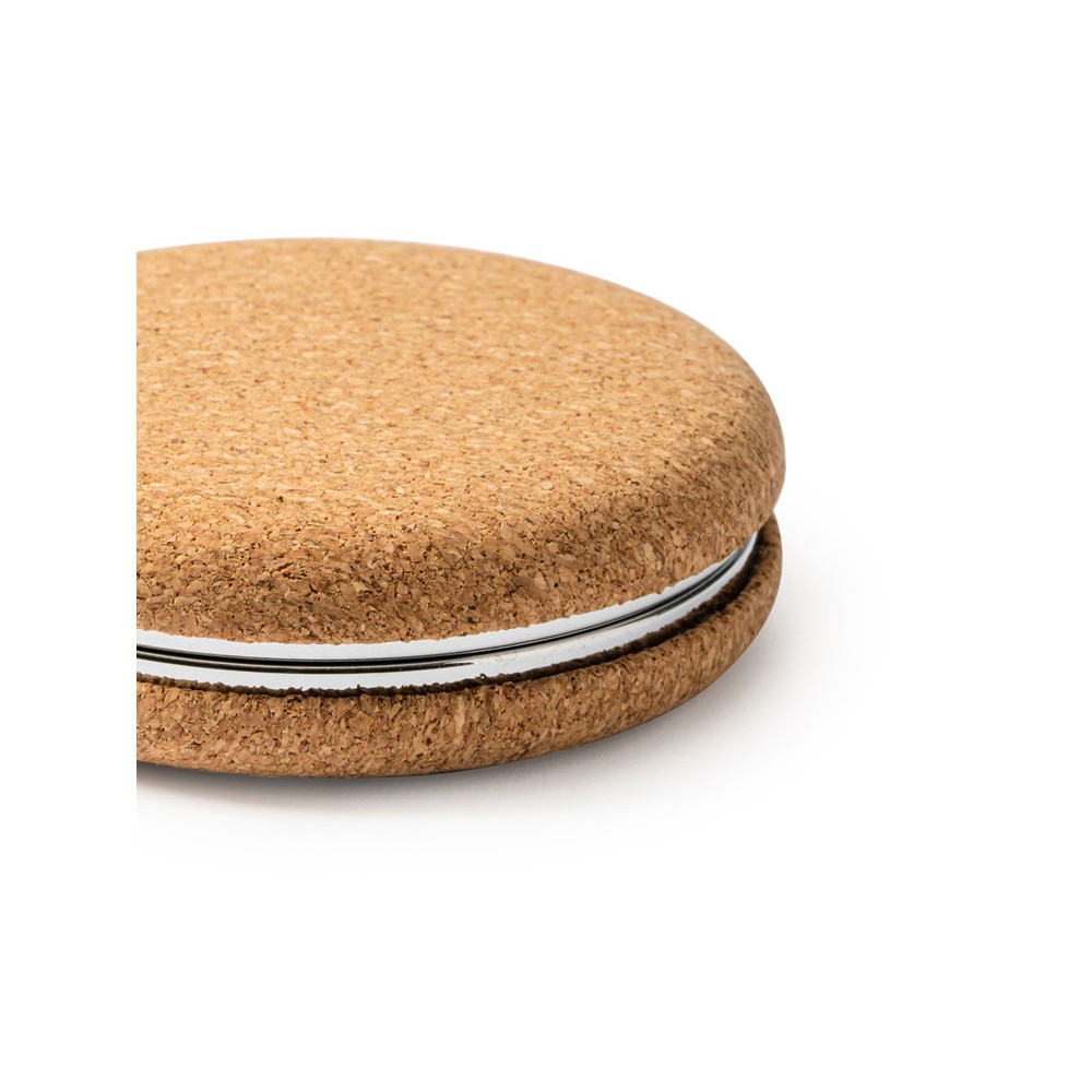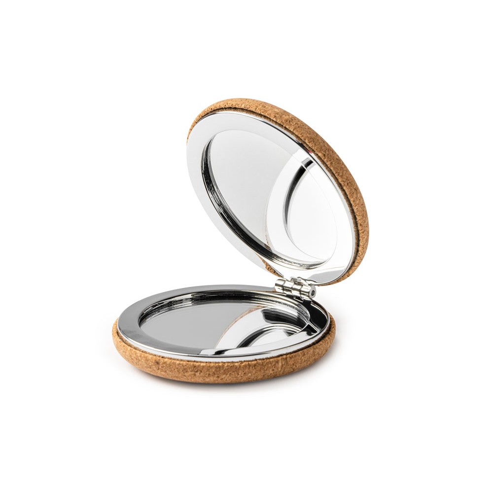 Складное зеркальце из натуральной пробки и хромированного металла, состоящее из двух зеркал, обычного и увеличивающего.