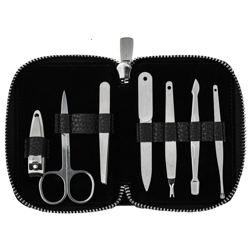 Комплектность пилочка для ногтей, ножницы, пинцет, ножницы для стрижки ногтей, очиститель для ушей, средство для удаления кутикул и вилка для ухода за кожей
