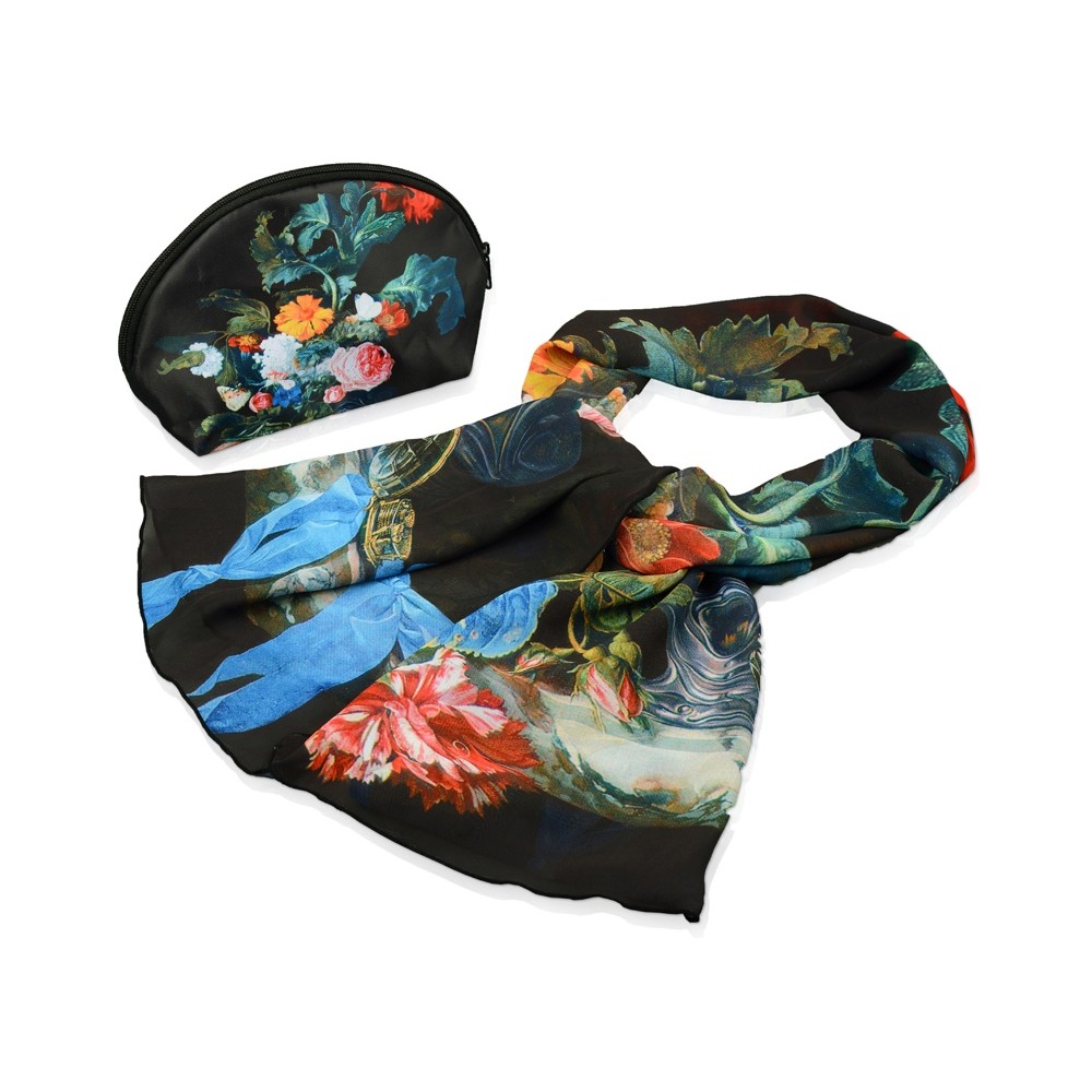 Изысканный подарочный набор для стильной женщины. Косметичка и шарф с цветочным принтом, выполненные в едином стиле, станут отличным дополнением к образу. Настоящий вкус проявляется в деталях.