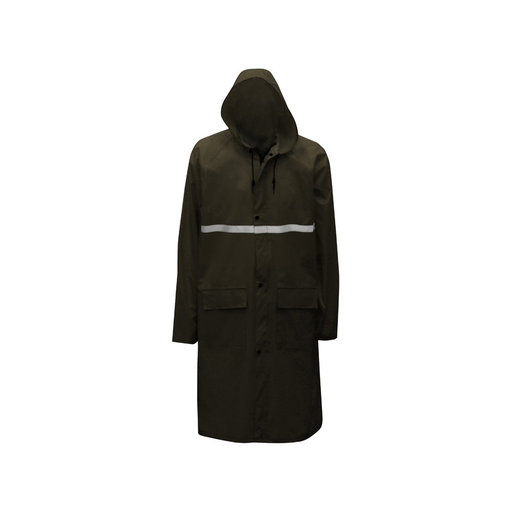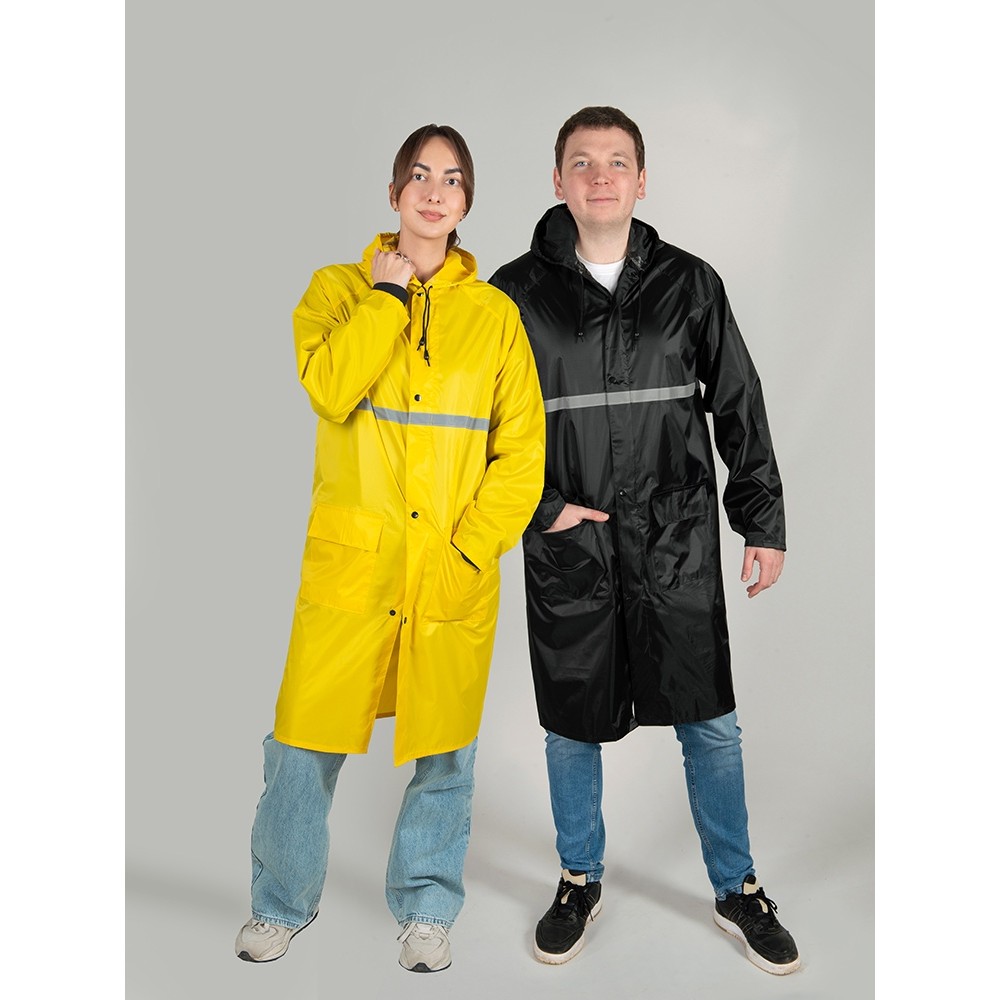 Светоотражающая тесьма на груди и спине делает человека в плаще заметным даже в темное время суток. Вместительные накладные карманы защищены сверху клапаном.