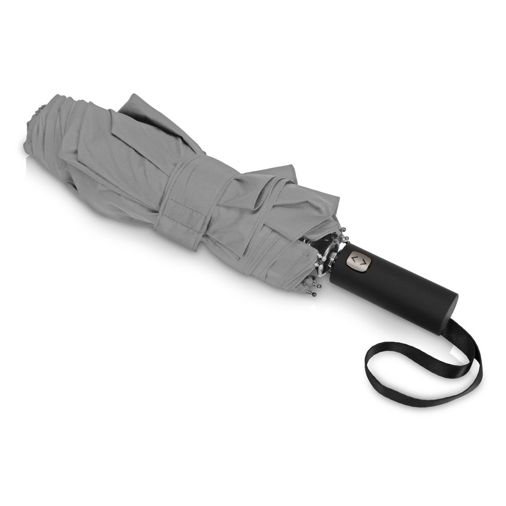 Купол этого складного зонта-автомата состоит из двух полотен и имеет большой диаметр 127 см. Прочный каркас и спицы из стекловолокна устоят при порывах ветра. Благодаря этому зонт служит надежным укрытием в самый сильный дождь. Закрывается в 3 сложения. Ручка обработана мягким покрытием soft-touch. Широкий хлястик для удобства персонализации.