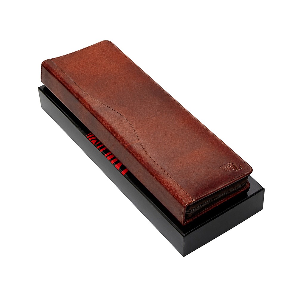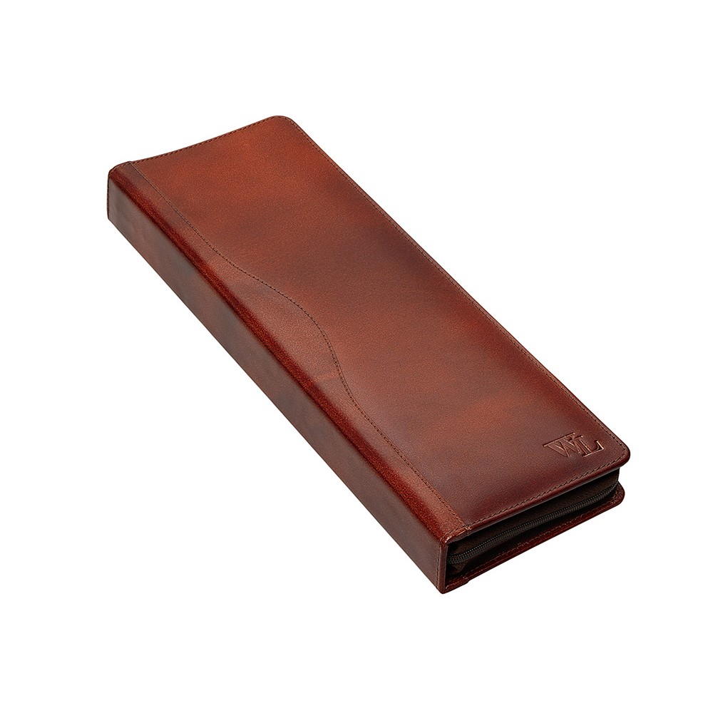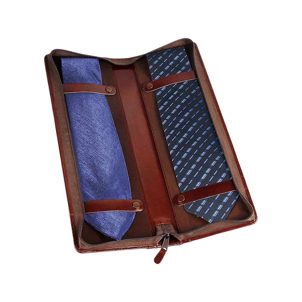 Компактный чехол для хранения галстуков оснащен двумя креплениями. Чехол выполнен из натуральной кожи коричневого оттенка. Благодаря чехлу аккуратно хранить и брать с собой галстуки в командировку стало еще удобнее.