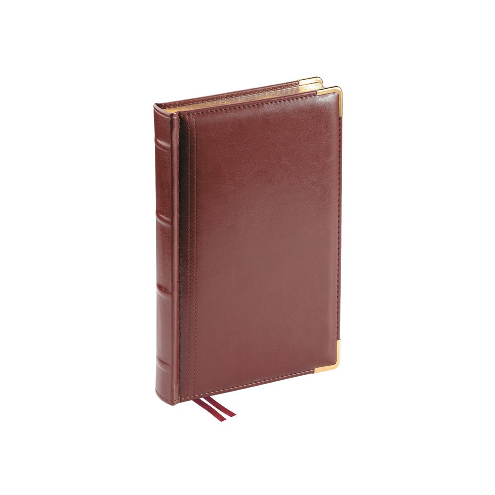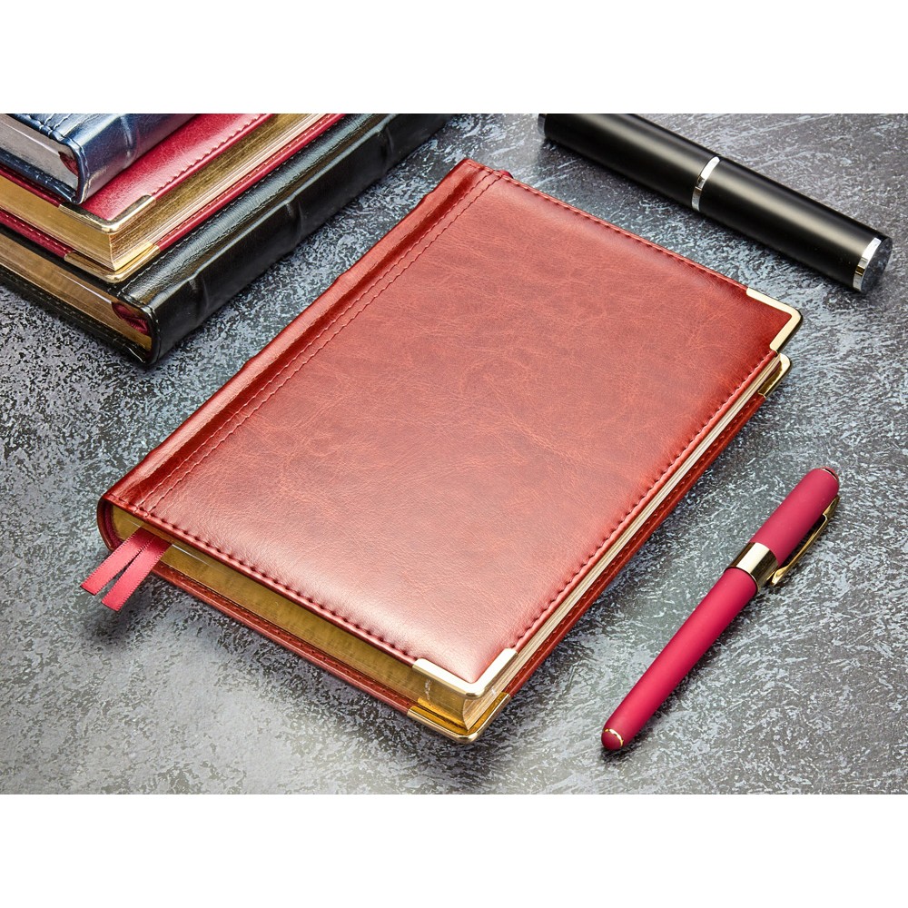 Классический деловой ежедневник линии Boss – образец элегантности. Гладкую тонкую фактуру экокожи подчеркивает декоративная строчка по контуру и металлические закругленные уголки золотистого цвета.
