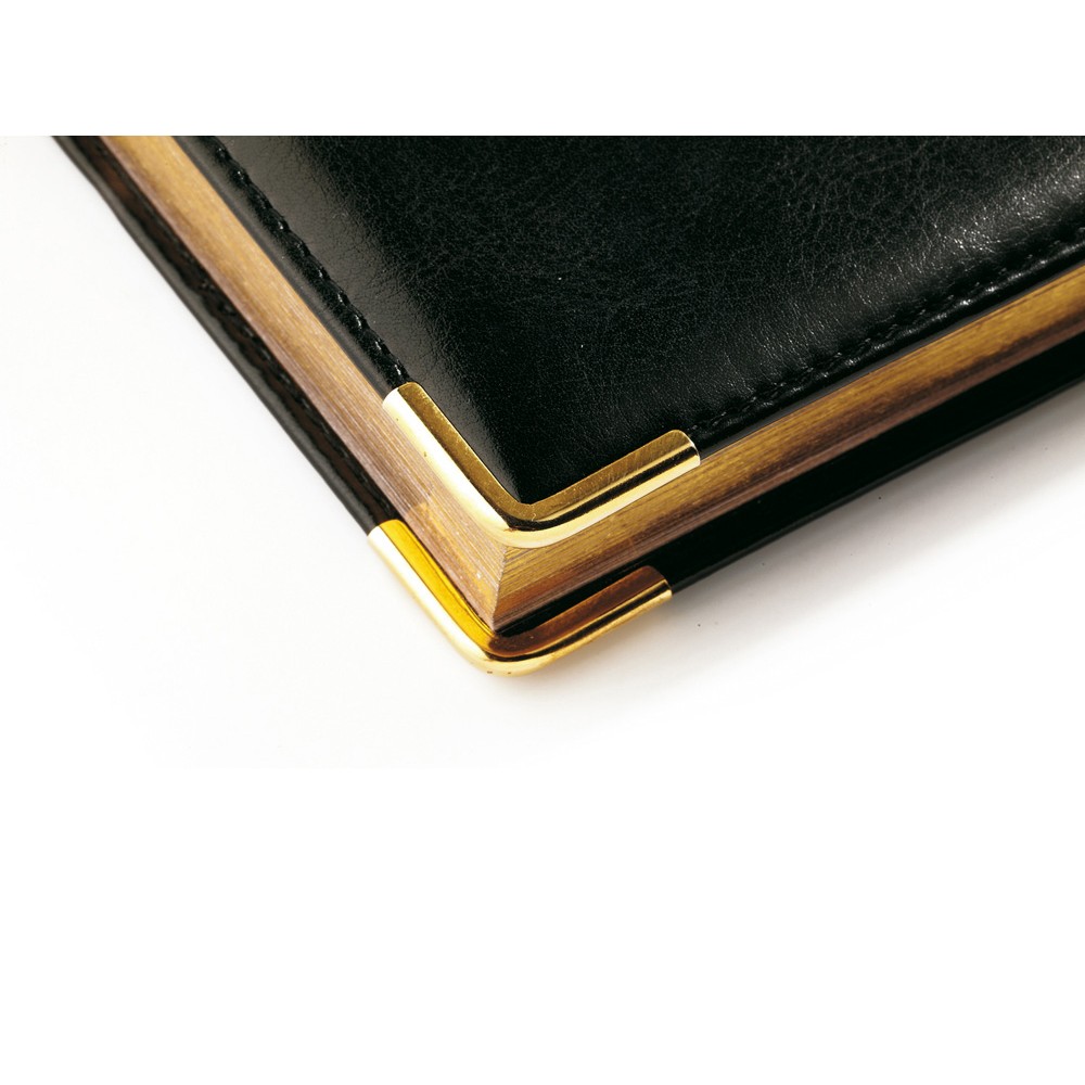 Классический деловой ежедневник линии Boss – образец элегантности. Гладкую тонкую фактуру экокожи подчеркивает декоративная строчка по контуру и металлические закругленные уголки золотистого цвета.