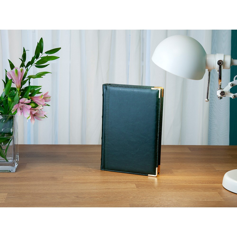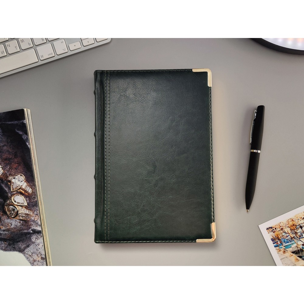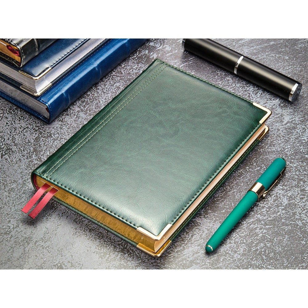 Классический деловой ежедневник линии Boss – образец элегантности. Гладкую тонкую фактуру экокожи подчеркивает декоративная строчка по контуру и металлические закругленные уголки золотистого цвета.