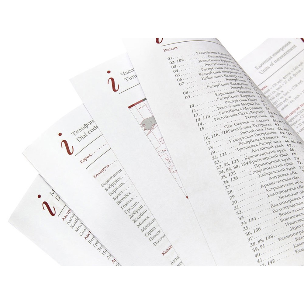 В ежедневнике есть полезная справочная информация и телефонная книга, а также страницы для записи идей, мыслей и составления рабочих планов. Есть перфорация (нижние уголки отрывные). Для изготовления страниц используется качественный бежевый офсет повышенной плотности (80 г/кв м), которая производится японской фирмой "Daiwa" и подходит для всех видов чернил.