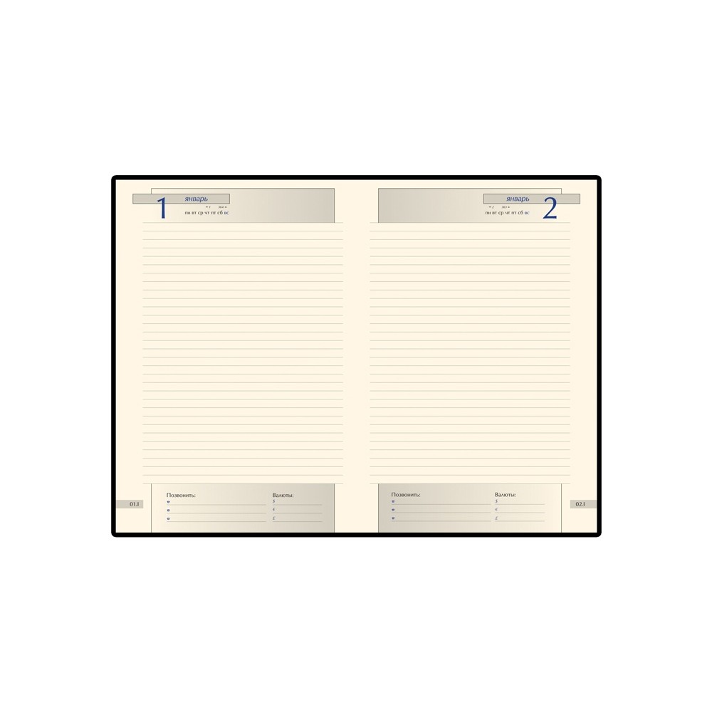 В ежедневнике есть полезная справочная информация и телефонная книга, а также 416 страниц для записи идей, мыслей и составления рабочих планов. Для изготовления страниц используется качественный бежевый офсет повышенной плотности (70 г/кв м), которая производится японской фирмой "Daiwa" и подходит для всех видов чернил.