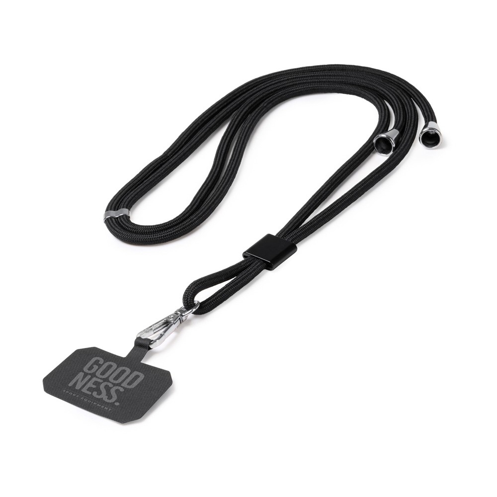 Держатель для мобильного телефона на шнурке из переработанного полиэстера RPET. Регулируемый ремешок, в комплект входит карабин.