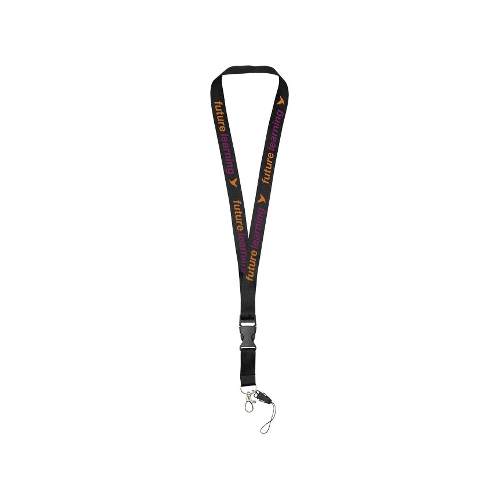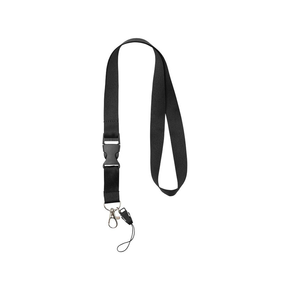 Многофункциональный шнурок с отстегивающейся пряжкой, овальным крючком с зажимом и держателем для телефона. Идеально подходит для бейджа, удостоверения личности или ключей. Предлагается широкий выбор цветов с большим участком для нанесения логотипа. Полиэстер.
