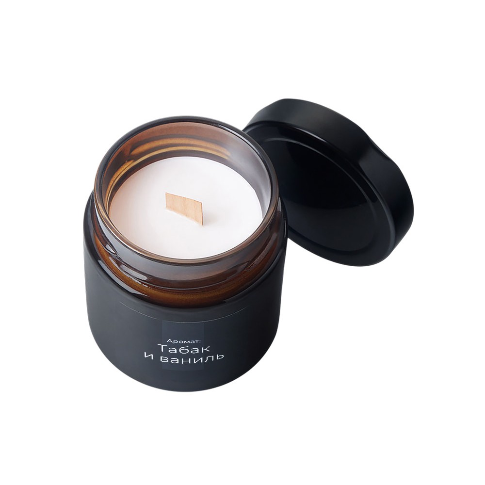 • Свеча в стеклянной коричневой банке 200мл, аромат "Табак и ваниль", фитиль деревянный