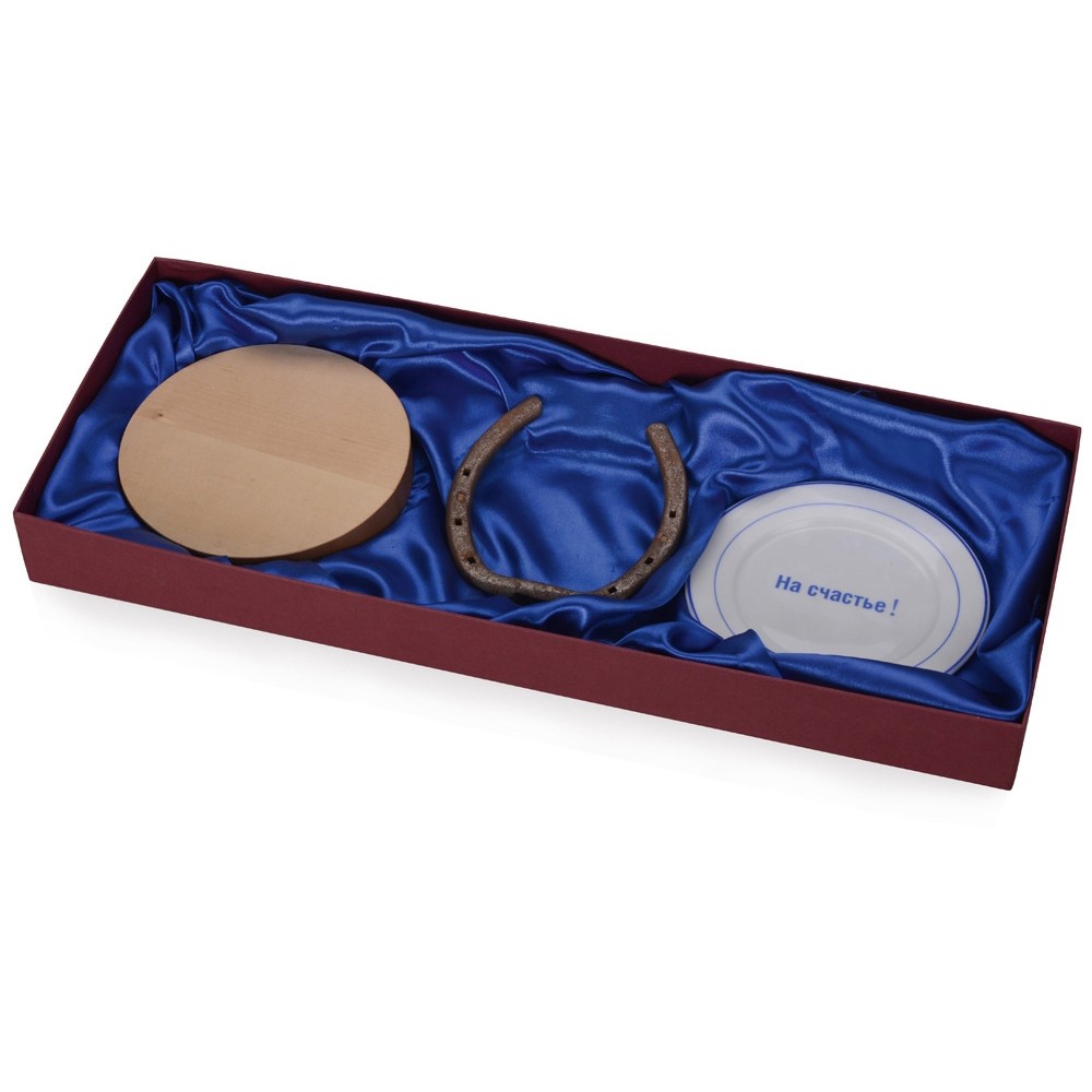 В набор входят: кусок дерева, для того чтобы постучать по деревянному и отвести неприятности, настоящая подкова победителя скачек, тарелка «На счастье»