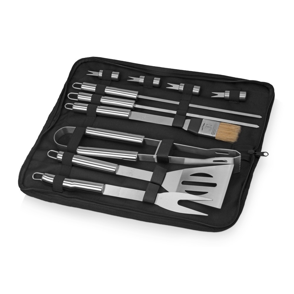 Практичный и функциональный набор для любителей барбекю и шашлыков на природе. В компактной упаковке богатое содержимое: щипцы, лопатка, вилка, кисточка, шампура, шпажки для шашлыка. Прекрасное дополнение ко всем праздникам и посиделкам на природе.