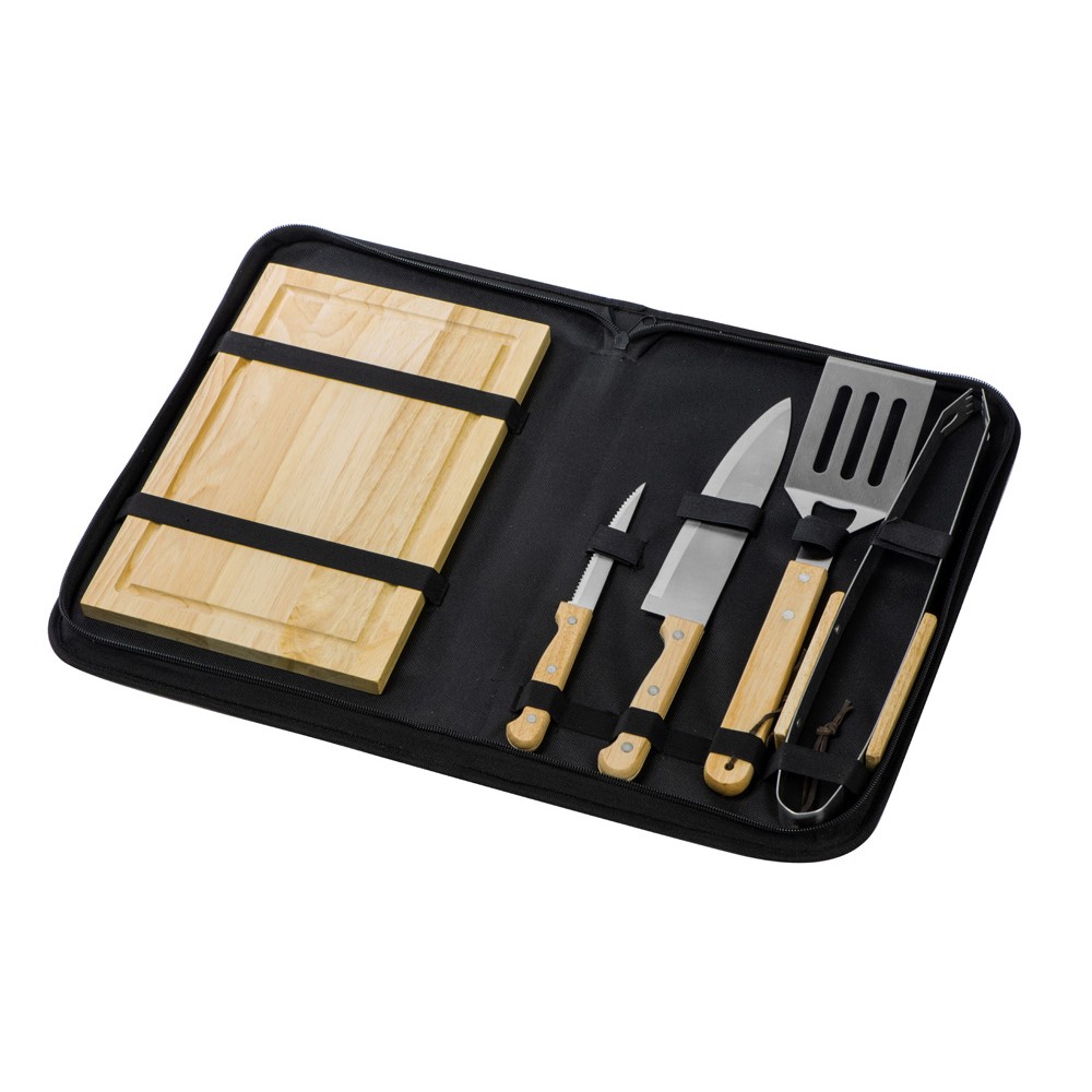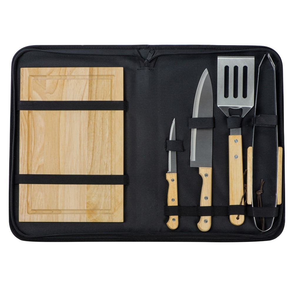 Комплектность разделочная доска 20 х 30 см, щипцы 34,5 см, лопатка 32,5 см, нож для стейка 21,5 см, нож большой 31,5 см, чехол из полиэстера 38,5 х 4,5 х 24,8 см