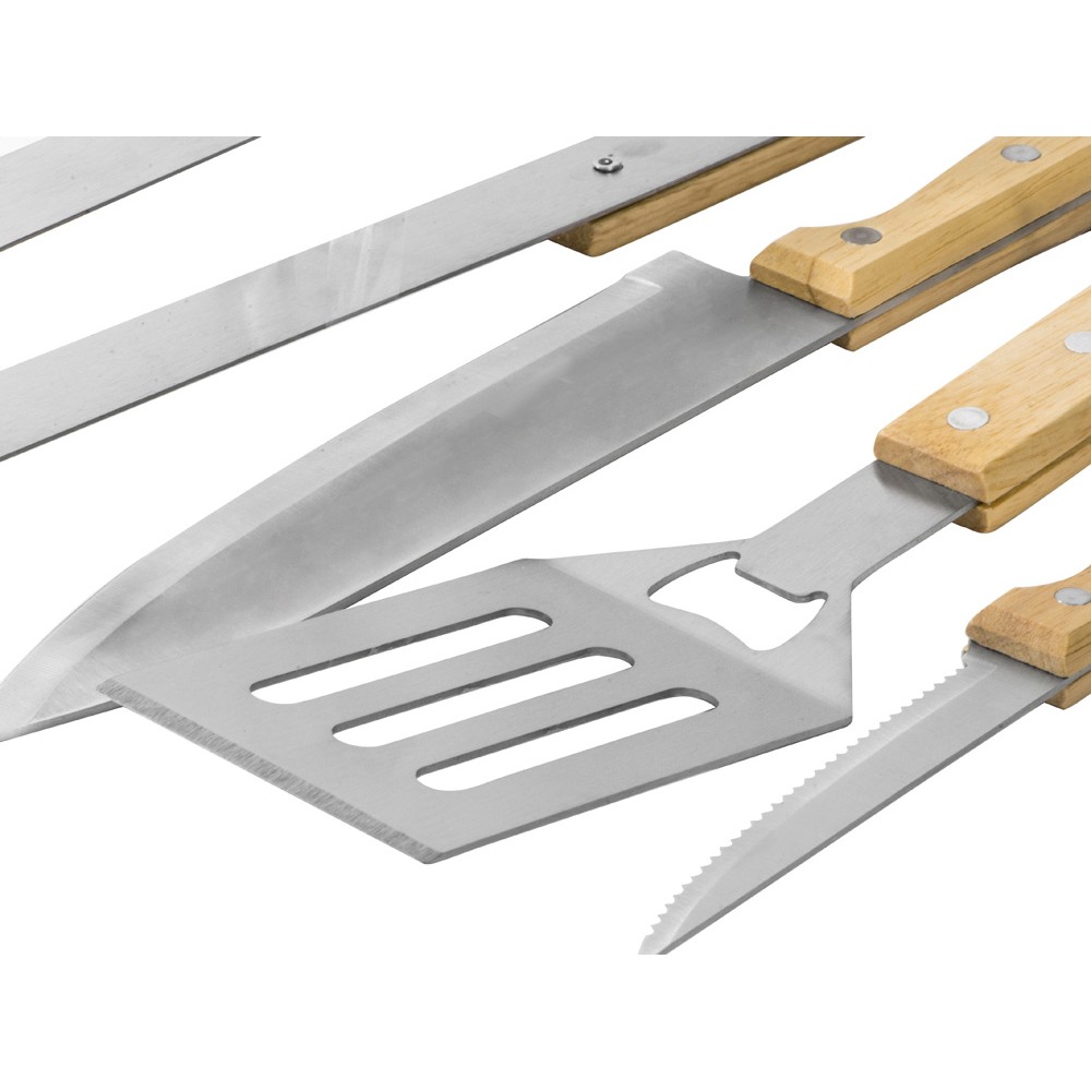 Благодаря длинным ручкам из каучукового дерева лопатку, ножи и щипцы удобно держать, не боясь горячих брызг при готовке. Деревянные ручки не нагреваются, что особенно ценно во время BBQ.