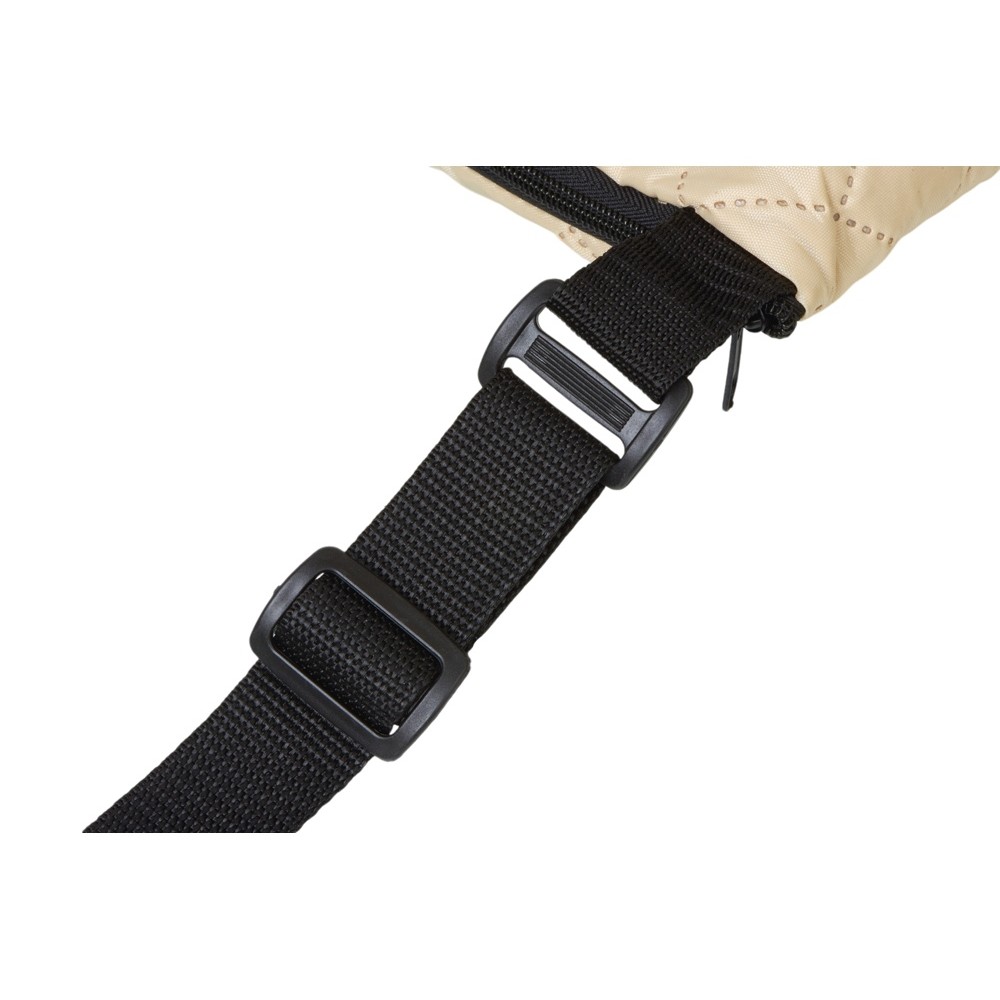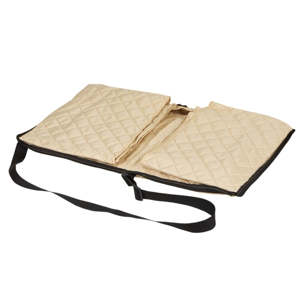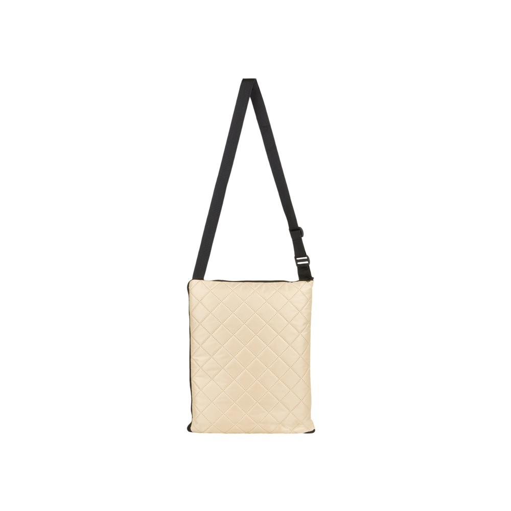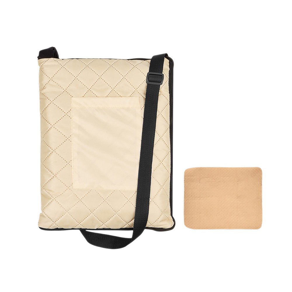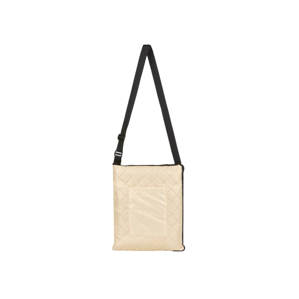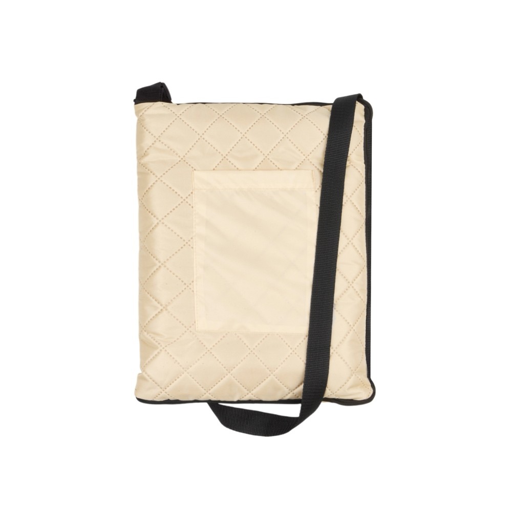 Двухсторонний плед с водоотталкивающим покрытием с одной стороны и мягким флисом с другой. Складывается в сумку на плечо и фиксируется с помощью молнии. В собранном виде имеет регулируемый по длине ремень для переноски и наружный карман для мелочей.
