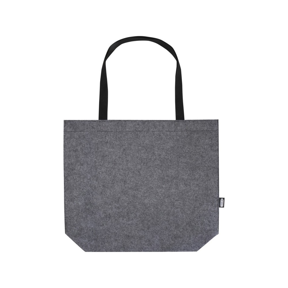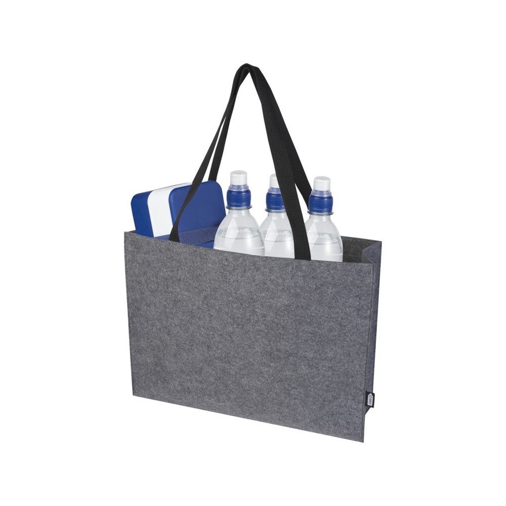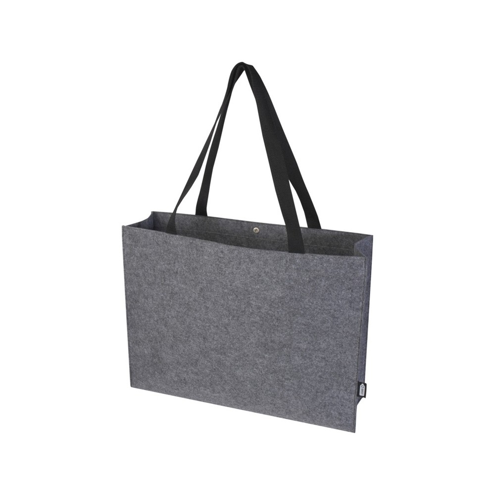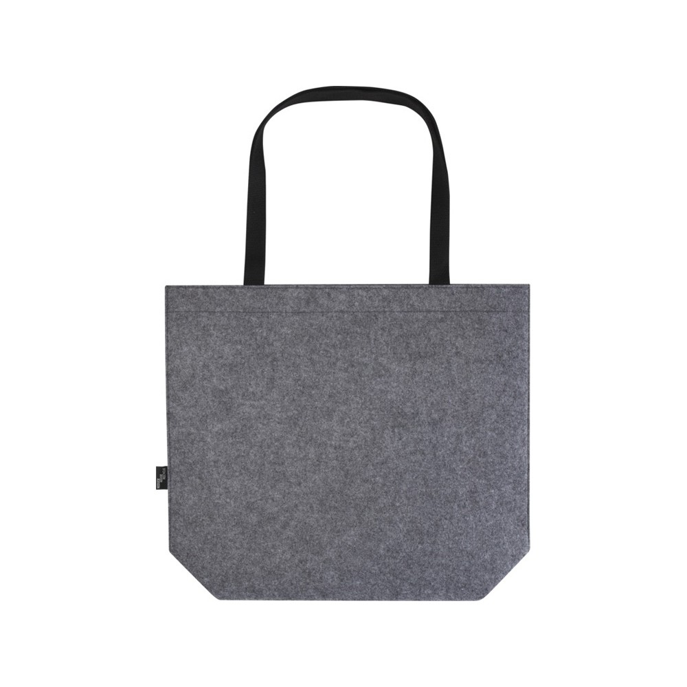 Большая эко-сумка с широким дном и боками из мягкого и прочного высококачественного переработанного фетра, сертифицированного согласно GRS. Сумка имеет большое основное отделение с объемом (до 20 литров), усиленные тканые хлопковые ручки (30 x 2,5 см) для оптимального удобства переноски и застежку-кнопку в верхней части. GRS certified recycled polyester.