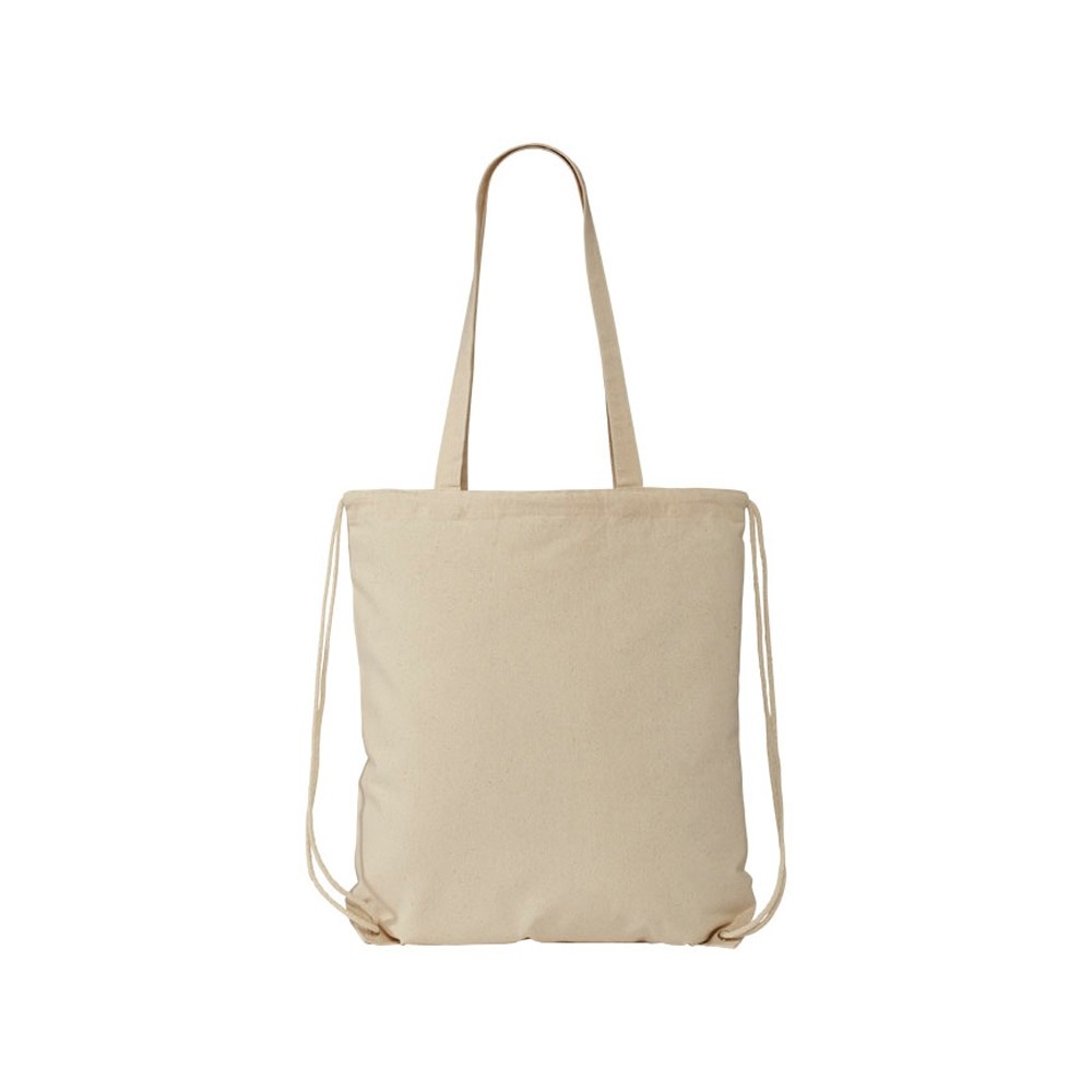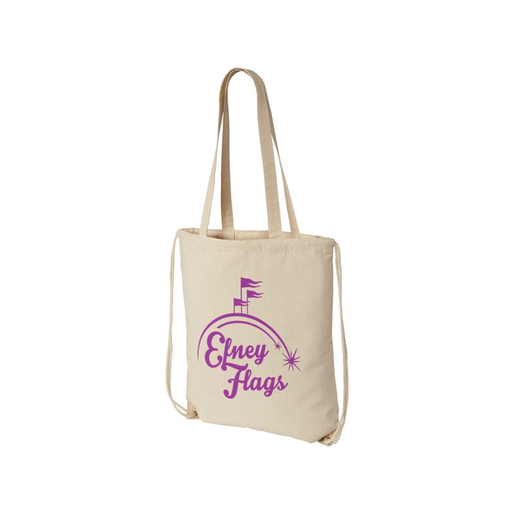 Многофункциональный хлопчатобумажный мешок с длинными ручками и затягивающим шнурком, который можно носить в качестве сумки для покупок или рюкзака. Большой основной отсек, закрывающийся затяжкой шнурка. Имеет две выпадающие ручки длиной 31 см. Вместимость: 16 л, выдерживает до 5 кг веса. Хлопок, 240 g/m2.