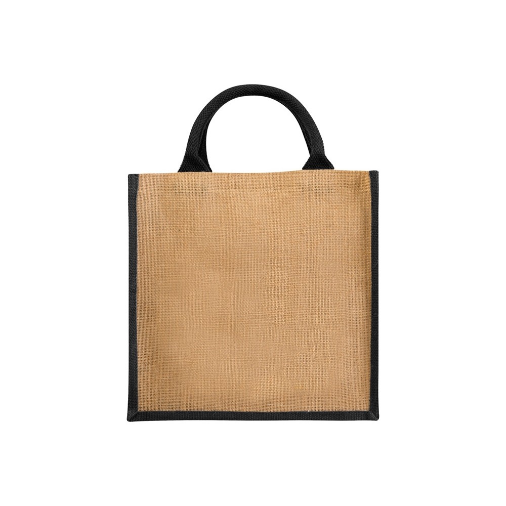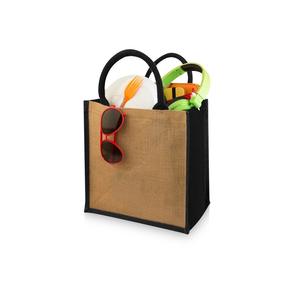 Джутовая подарочная сумка Chennai. Джутовая сумка с ламинированным открытым основным отделением и вставкой. Хлопковые ручки высотой 11,5 см. Джут.