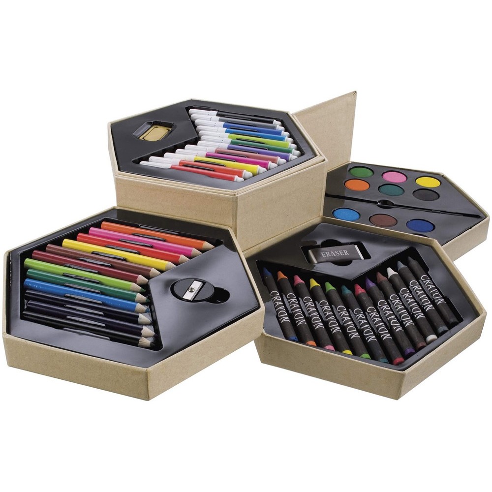 Набор из 52 предметов для рисования. 12 маркеров, 12 цветных карандашей, 12 восковых карандашей, 12 акварельных красок, кисточка, точилка, резинка и большая скрепка. Нанесение не делается на отдельные элементы набора. Картон.