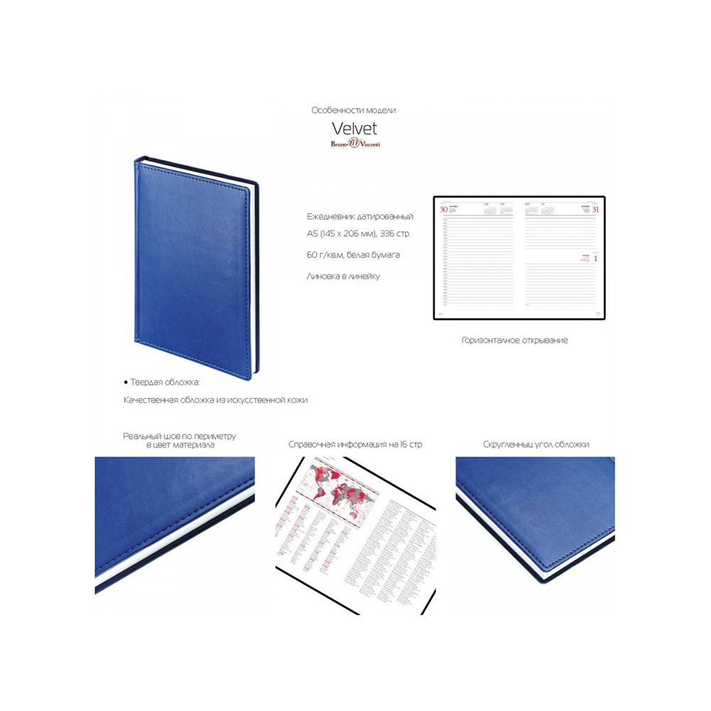 В серии Velvet представлены практичные и стильные модели ежедневников, в которых обложки выполнены из кожзаменителя с рельефом и прострочены по периметру декоративным швом. Закругленные уголки подчеркивают привлекательную и изящную форму ежедневника.