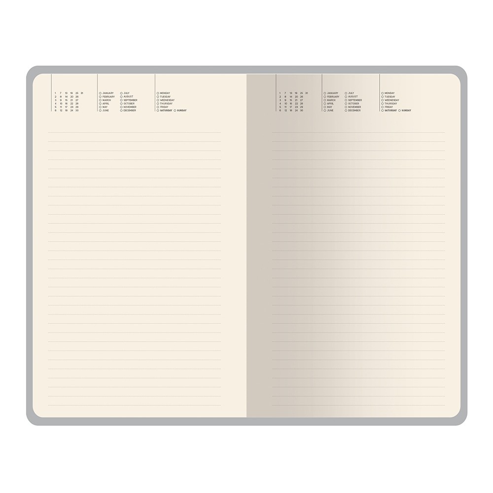 Внутри — недатированный блок формата А5 (125×200 мм) на бежевой бумаге 80 г/м². Книжный переплёт хорошо раскрывается, а скруглённые углы одновременно придают ежедневнику премиальный вид и защищают края при носке. Завершают детали ляссе в цвет обложки и петля для ручки — чтобы всё нужное было под рукой.