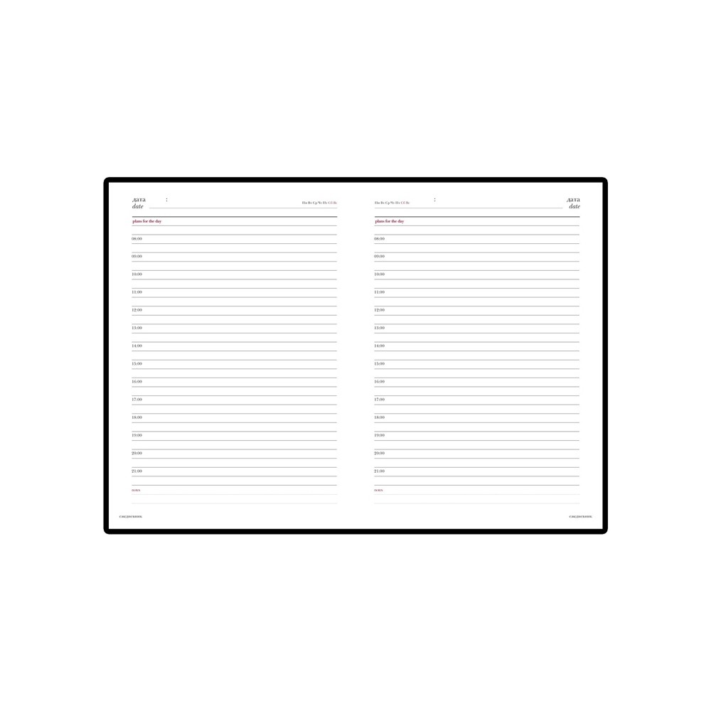 В ежедневнике «Sidney Nebraska» есть полезная справочная информация и телефонная книга на 18 листов, а также 272 страницы для записи идей, мыслей и составления рабочих планов. Для изготовления страниц используется качественный бежевый офсет повышенной плотности (70 г/кв м), который производится в Японии и подходит для всех видов чернил. Разметка блока с указанием времени позволяет планировать дела с точностью до 1 часа.