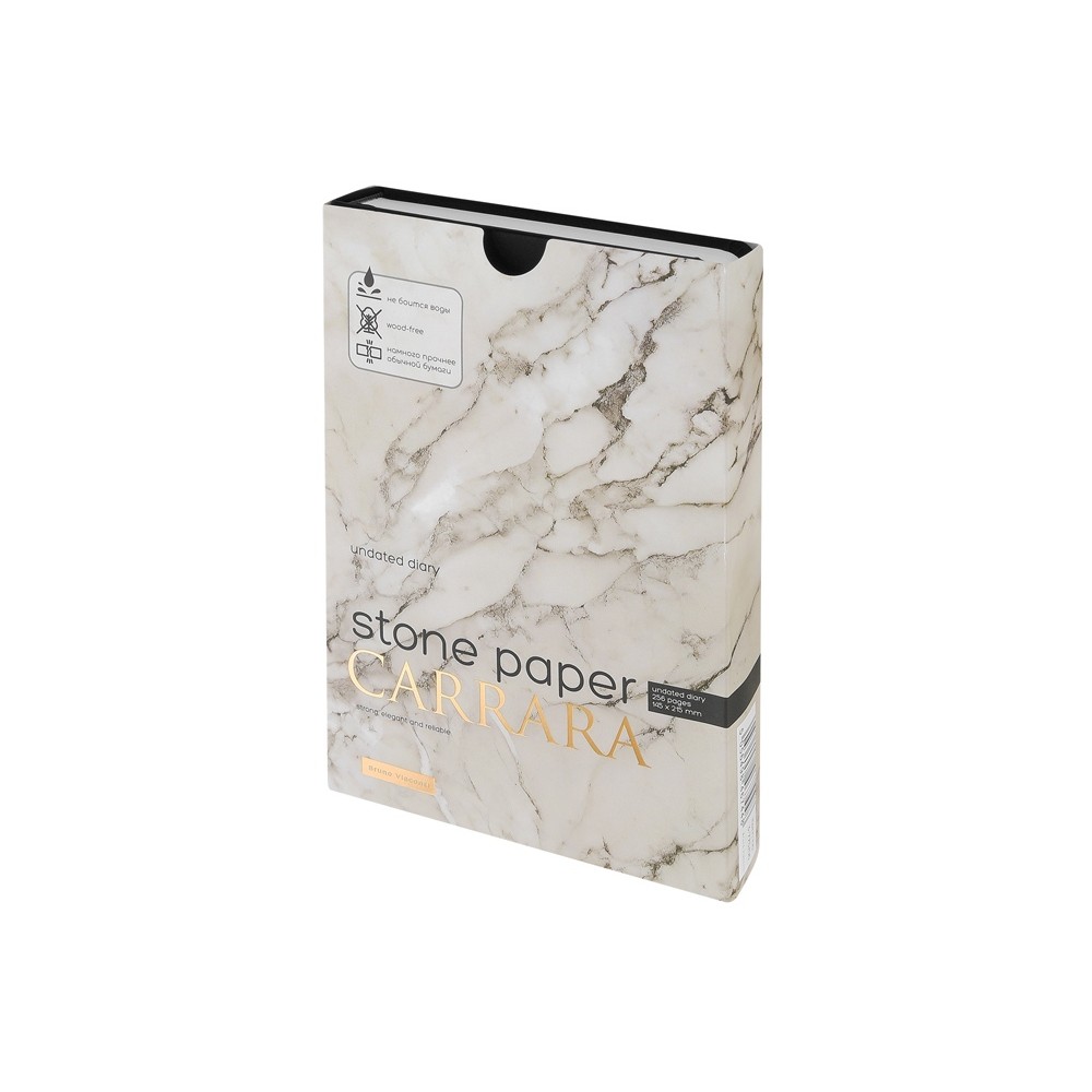 Уникальность недатированного ежедневника Carrara от Bruno Visconti — в его блоке. Он изготовлен из каменной бумаги плотностью 144 г/кв.м, отличающейся особой гладкостью и повышенной прочностью. Она не боится воды и пролитого кофе, достаточно просто протереть сухой салфеткой.