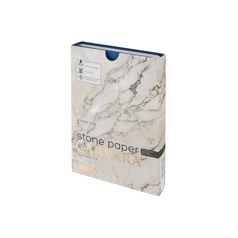 Уникальность недатированного ежедневника Carrara от Bruno Visconti — в его блоке. Он изготовлен из каменной бумаги плотностью 144 г/кв.м, отличающейся особой гладкостью и повышенной прочностью. Она не боится воды и пролитого кофе, достаточно просто протереть сухой салфеткой.