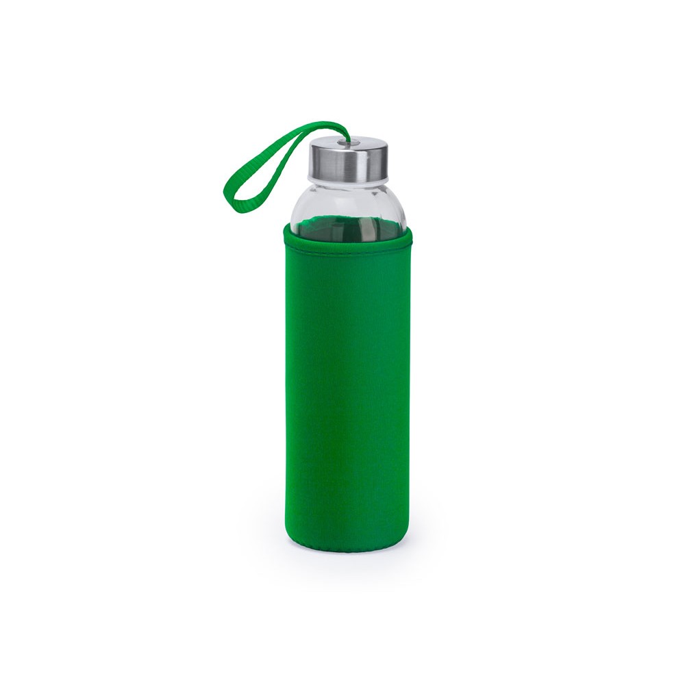 Стеклянная бутылка емкостью 500 мл, чехол из неопрена в сочетании с цветным ремешком для переноски.
