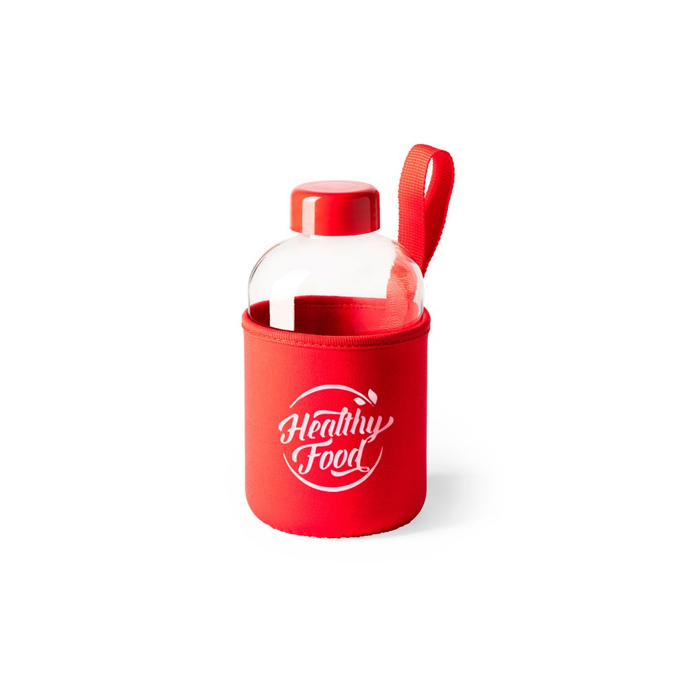 Стеклянная бутылка емкостью 600 мл. включает инновационный неопреновый чехол самых разных цветов с ручкой для переноски.
