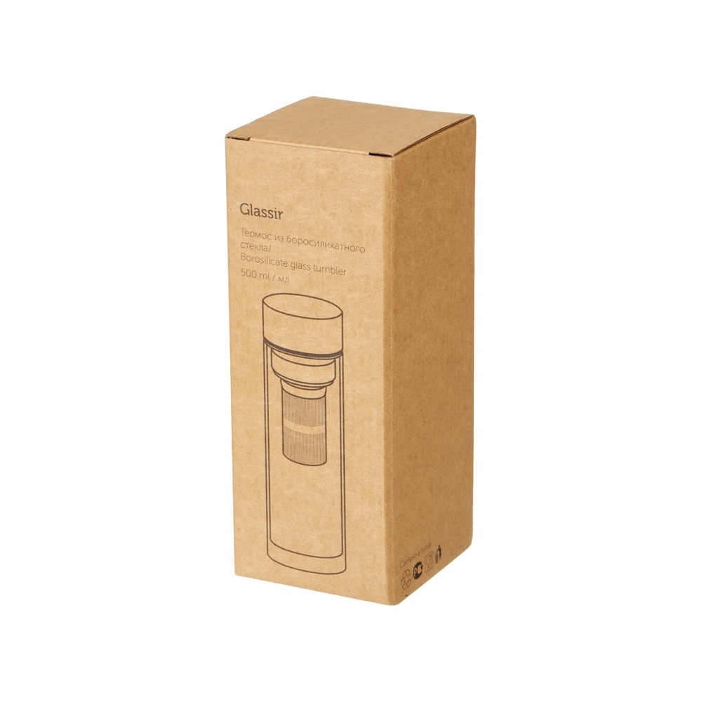 Термобутылка из жаростойкого боросиликатного стекла с углубленным составным ситечком. Позволяет сохранить температуру ваших любимых напитков течение 4-х часов. Корпус и стальная крышка идеально подходят под логотип, а общий минималистичный дизайн подчеркнет его. Объем 500мл.