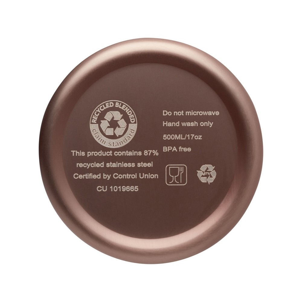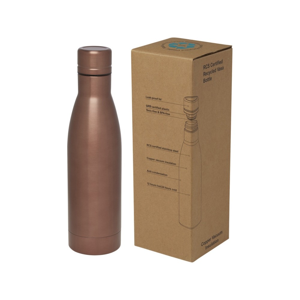 Ваши напитки останутся горячими в течение 12 часов и холодными в течение 24 часов в медной бутылке Vasa с вакуумной изоляцией. Бутылка с двойной стенкой и сделана из переработанной нержавеющей стали, сертифицированной по стандарту RCS, с вакуумной изоляцией и медным покрытием на внутренней стенке, что позволит вашему напитку оставаться абсолютно горячим или холодным словно лед, в зависимости от того, что вам нужно. Без содержания BPA, протестировано и одобрено согласно немецкому законодательству о безопасности пищевых продуктов (LFGB) и проверено на содержание фталатов согласно нормам REACH. Объем: 500 мл. Поставляется в подарочной коробке из экологичного и ответственного материала. 87% Recycled stainless steel, 13% Пластик PP. #?0:>2:0: FSC Mix Credit P5.1 CU-COC-877277.