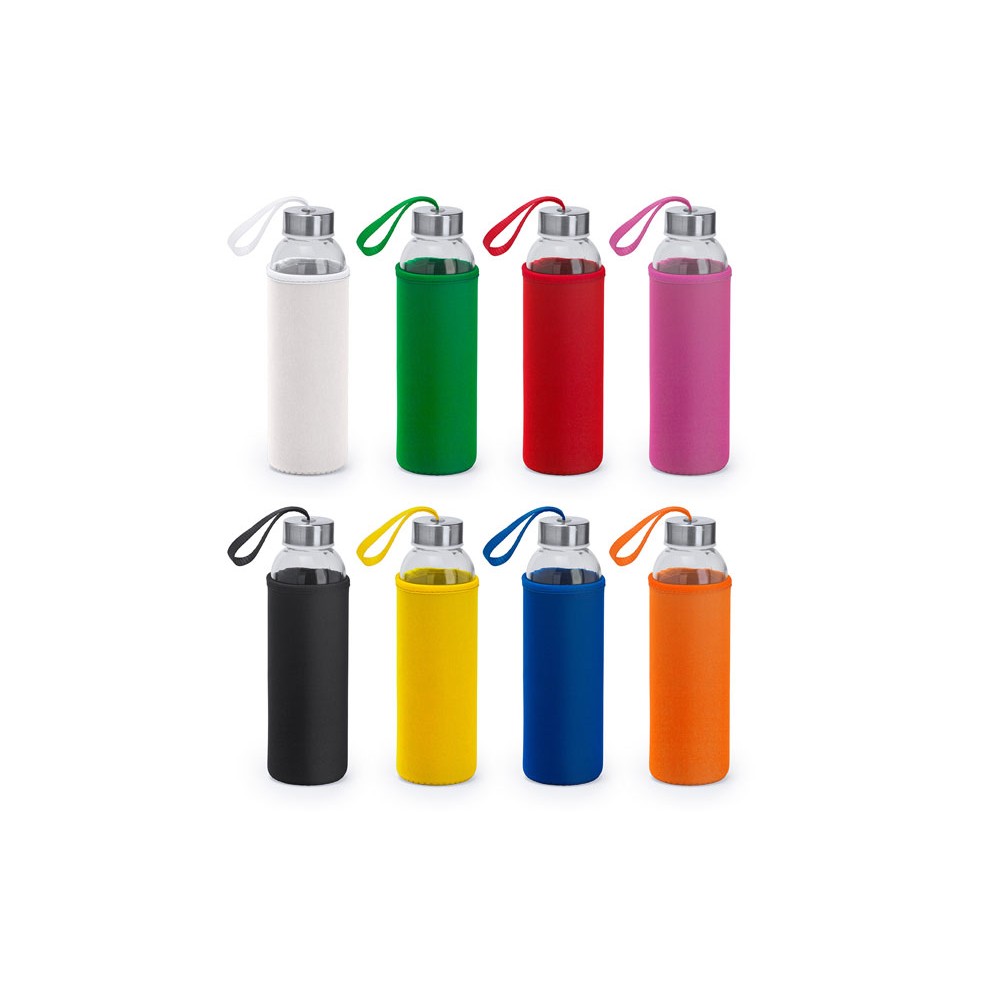 Стеклянная бутылка емкостью 500 мл, чехол из неопрена в сочетании с цветным ремешком для переноски.