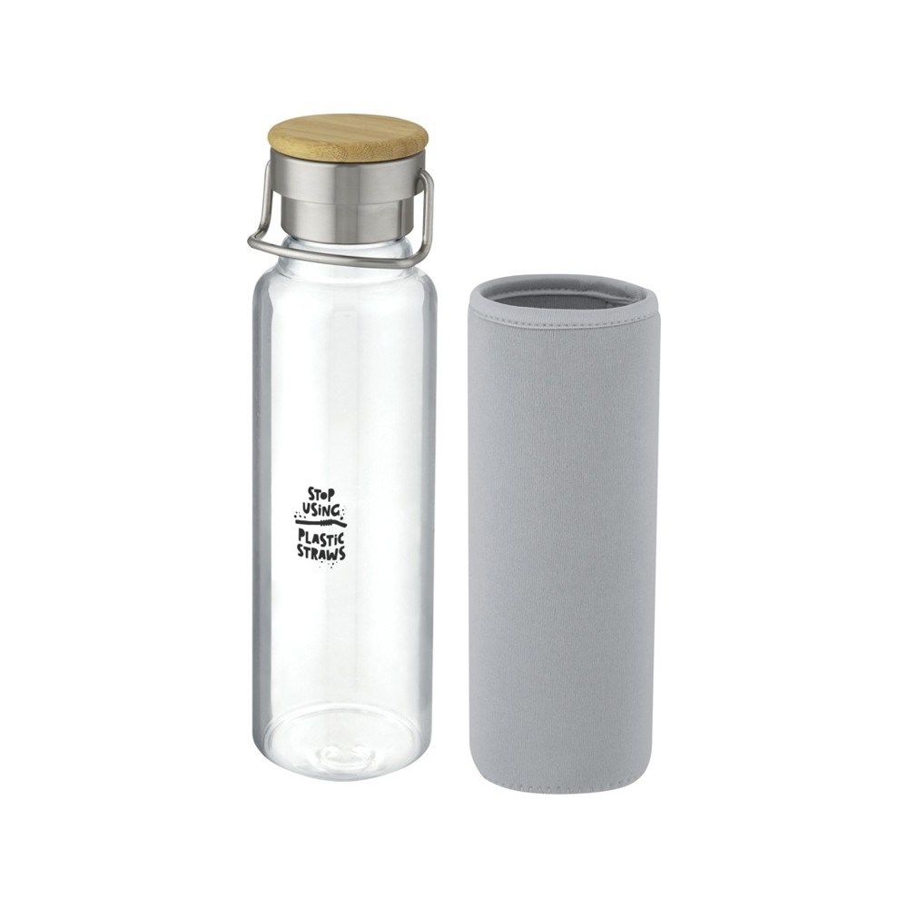 Одностенная бутылка из боросиликатного стекла с неопреновым защитным чехлом. Имеет съемную крышку с бамбуковым колпачком и ручку для удобной переноски. Бутылка изготовлена из 100% прочного боросиликатного стекла, которое не содержит вредных химических веществ и сохраняет свежесть напитка. Не содержит БФА, испытана и одобрена в соответствии с немецким законодательством о безопасности пищевых продуктов (LFGB). Проверена на содержание фталатов и одобрена для использования в соответствии с правилами REACH. Бамбук используется из устойчивых, экологически и социально ответственных источников. Объем 660 мл. Сняв неопреновый чехол и крышку, бутылку можно мыть в посудомоечной машине. В подарочной коробке из переработанного картона.