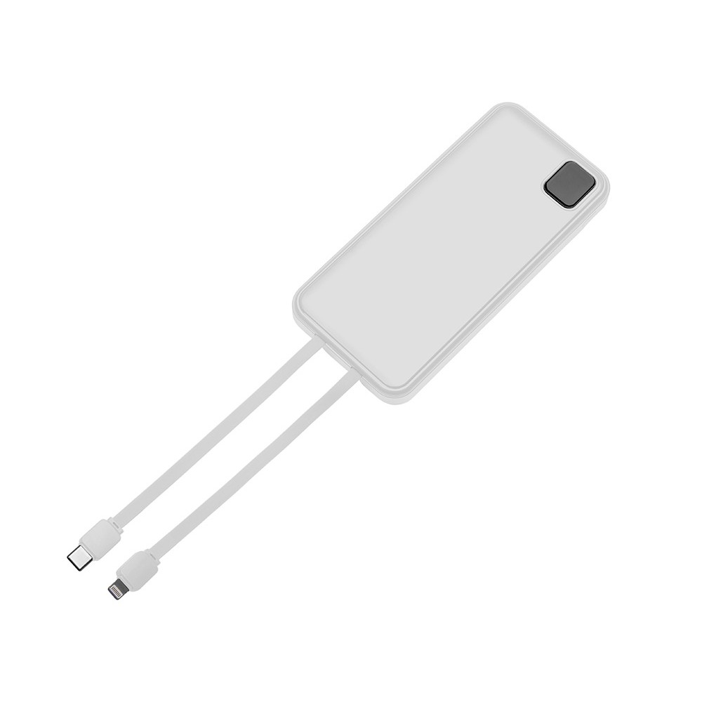 Удобный внешний аккумулятор с встроенными кабелями USB-C и Lightning — ваш надежный партнер в путешествиях, на встречах и в повседневных задачах. Цифровой дисплей в реальном времени показывает точный остаток заряда, а компактные габариты делают его таким же удобным, как смартфон. Прочный корпус из переработанного АБС-пластика и емкость 10000 мАч обеспечивают долгую работу даже при интенсивном использовании. Идеальный выбор для тех, кто ценит комфорт и функциональность в одном устройстве. Продуманная упаковка: для открытия просто потяните за язычок, и появится гаджет с нанесением.