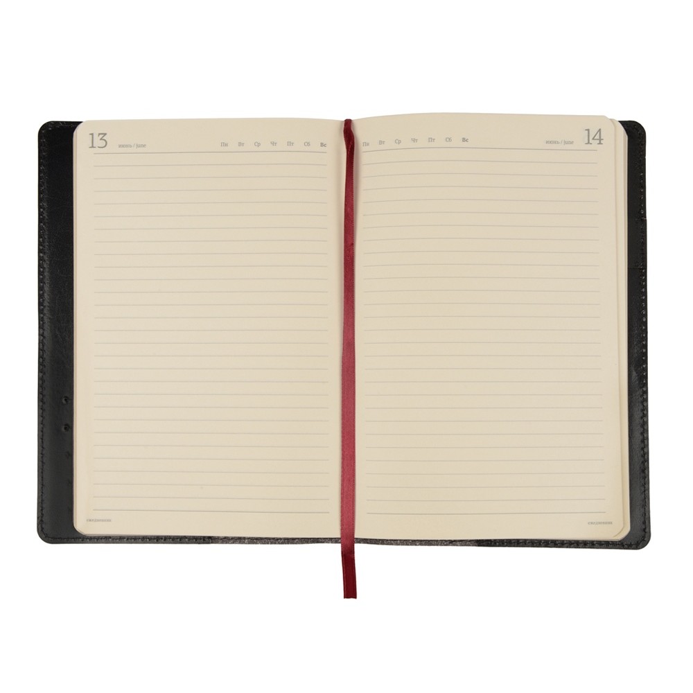 Ежедневник формата А5 выпускается размером 143*216 мм. Полудатированный сменный блок включает 416 страниц бежевого цвета.