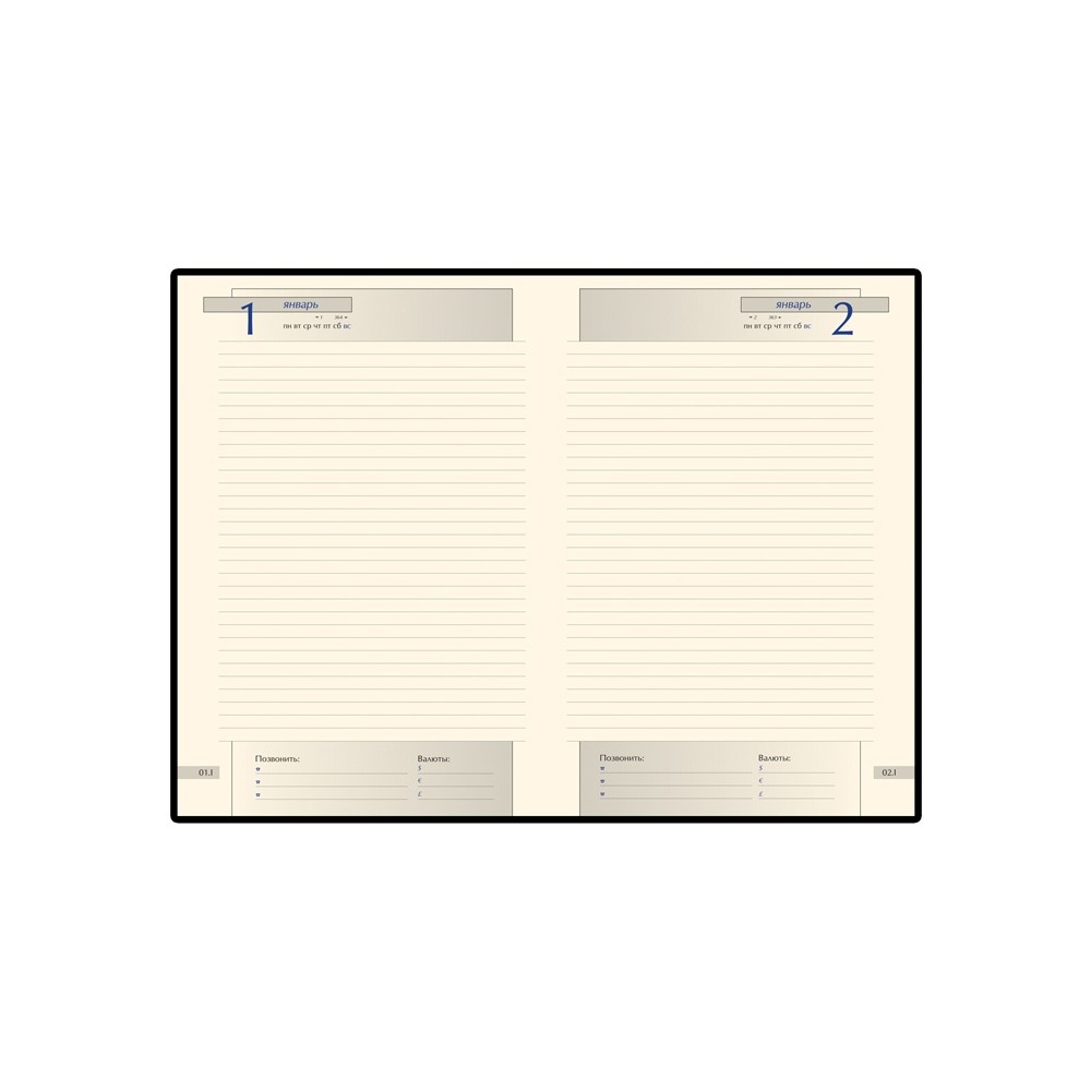 В ежедневнике есть полезная справочная информация и телефонная книга, а также 416 страниц для записи идей, мыслей и составления рабочих планов. Для изготовления страниц используется качественный бежевый офсет повышенной плотности (70 г/кв м), которая производится японской фирмой "Daiwa" и подходит для всех видов чернил.