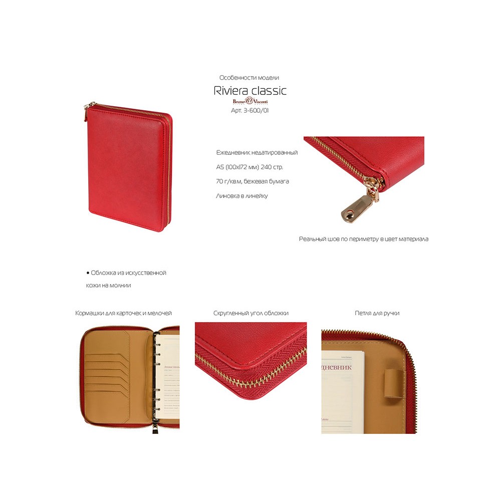Великолепный ежедневник из качественной искусственной кожи, который заменит вам портмоне и органайзер. В ежедневнике предусмотрены карманы для карточек, сменный блок на кольцах. Внутри достаточно места для ручки и даже для мобильного телефона. Сам ежедневник закрывается на молнию. Его удобно брать с собой и на переговоры, и на деловой обед. Блок отпечатан в 2 цвета на бежевой бумаге плотностью 70 г/м2.