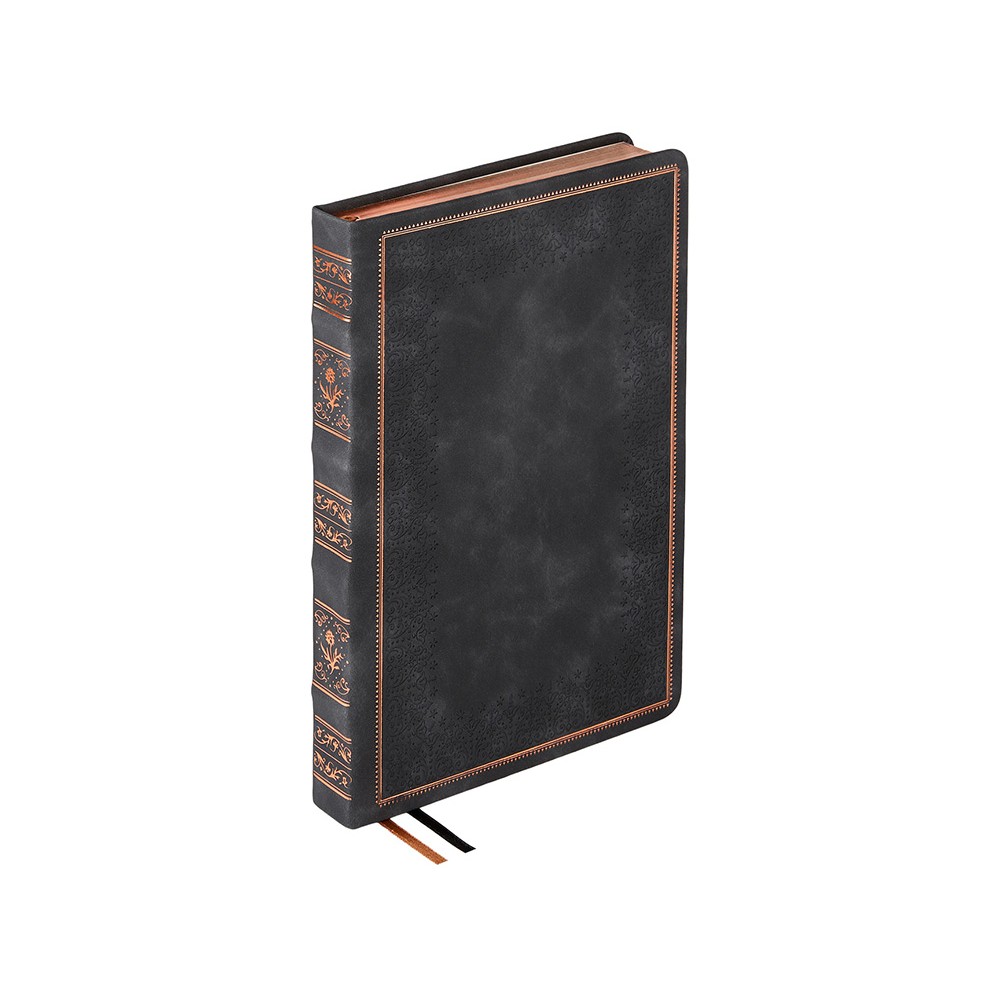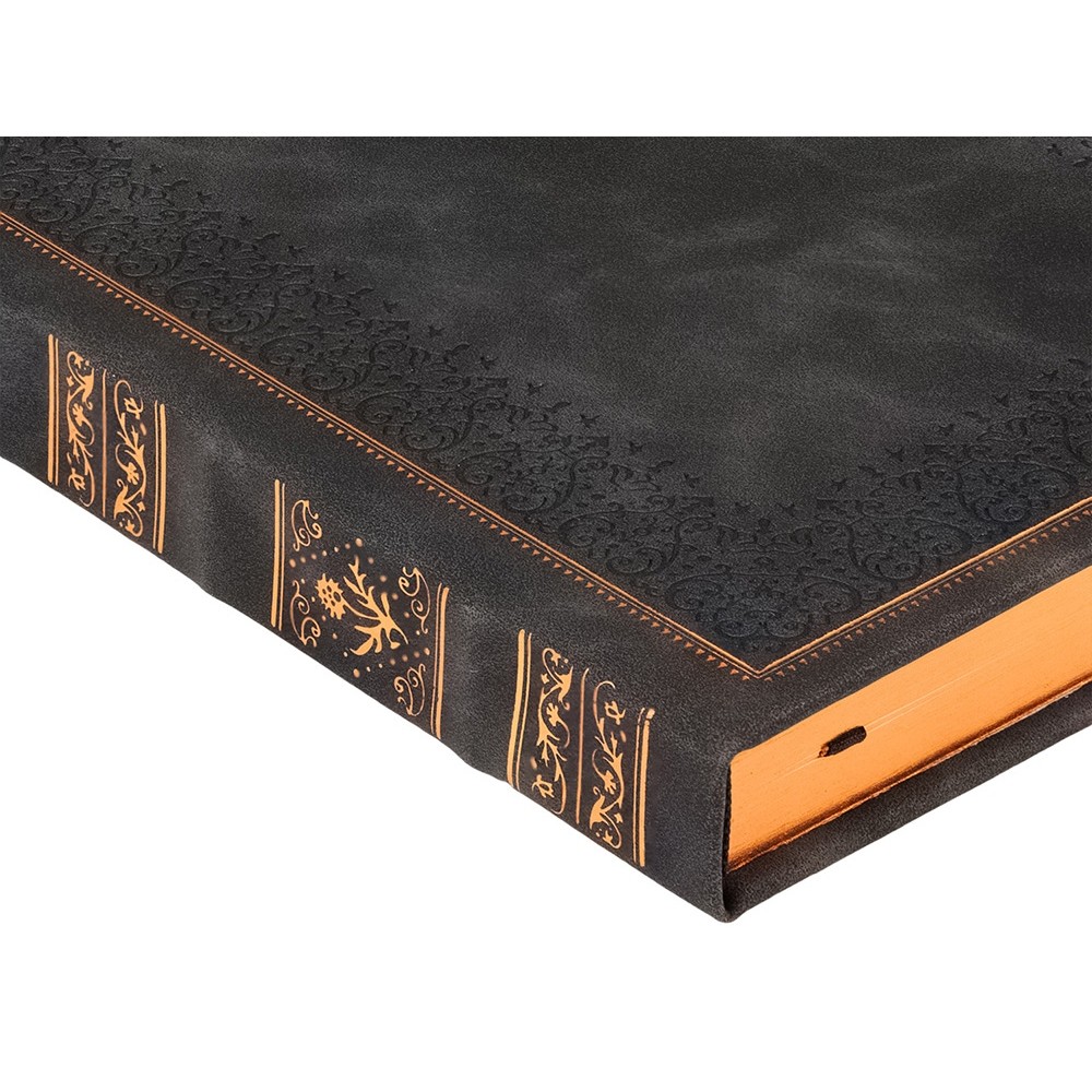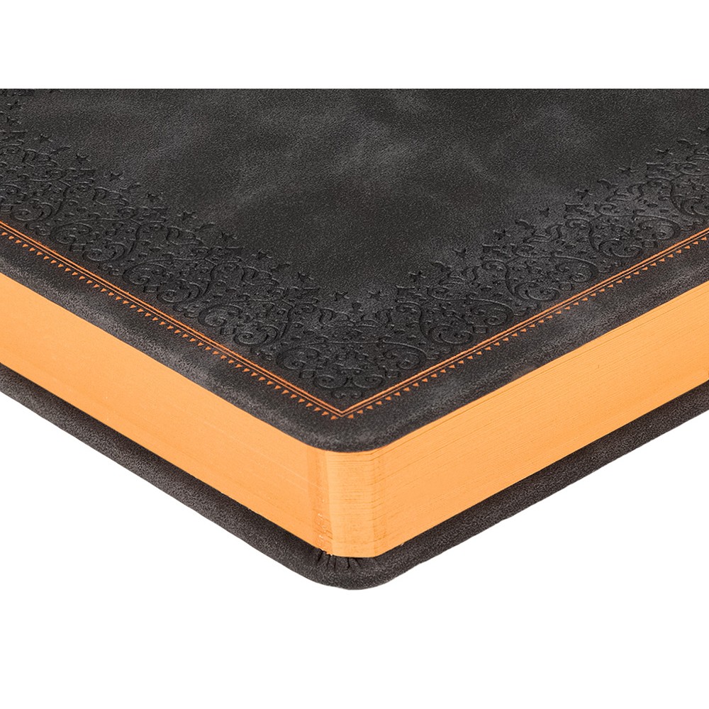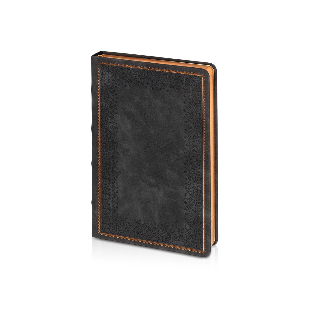 Недатированный ежедневник "Royal" формата А5 с твердой обложкой из искусственной кожи с имитацией нубука украшен художественным бронзовым и блинтовым тиснением. Внутри 256 страниц, выполненных из качественной бежевой бумаги в линейку плотностью 100 г/м². Два шелковых ляссе в цвет обреза блока и обложки облегчают навигацию по записям. Французский корешок дополнительно декорирован изящным бронзовым тиснением в виде виньеток. Скругленные углы обложки и блока подчеркивают стильный дизайн изделия, а блеск бронзового обреза дарит ежедневнику благородный и роскошный внешний вид.