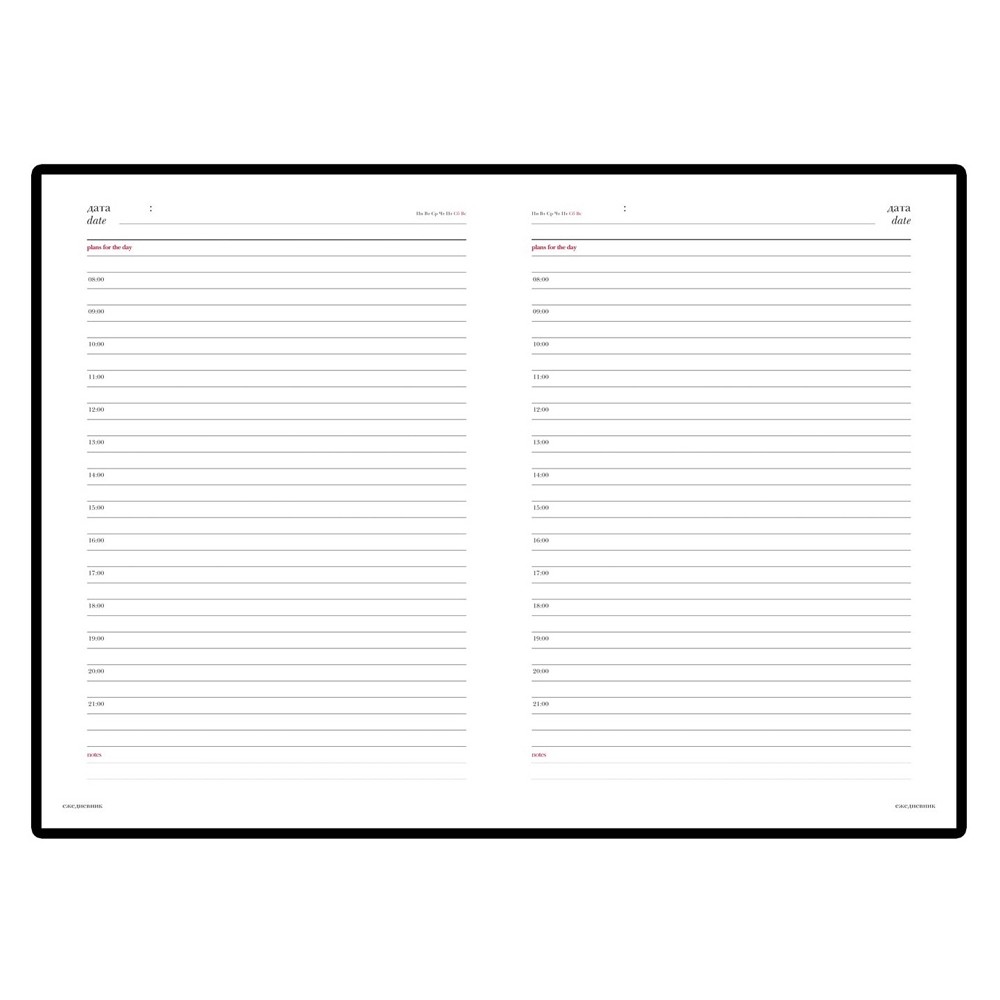 В ежедневнике «Sidney Nebraska» есть полезная справочная информация и телефонная книга на 18 листов, а также 272 страницы для записи идей, мыслей и составления рабочих планов. Для изготовления страниц используется качественный белый офсет повышенной плотности (70 г/кв м), который производится в Японии и подходит для всех видов чернил. Разметка блока с указанием времени позволяет планировать дела с точностью до 1 часа.