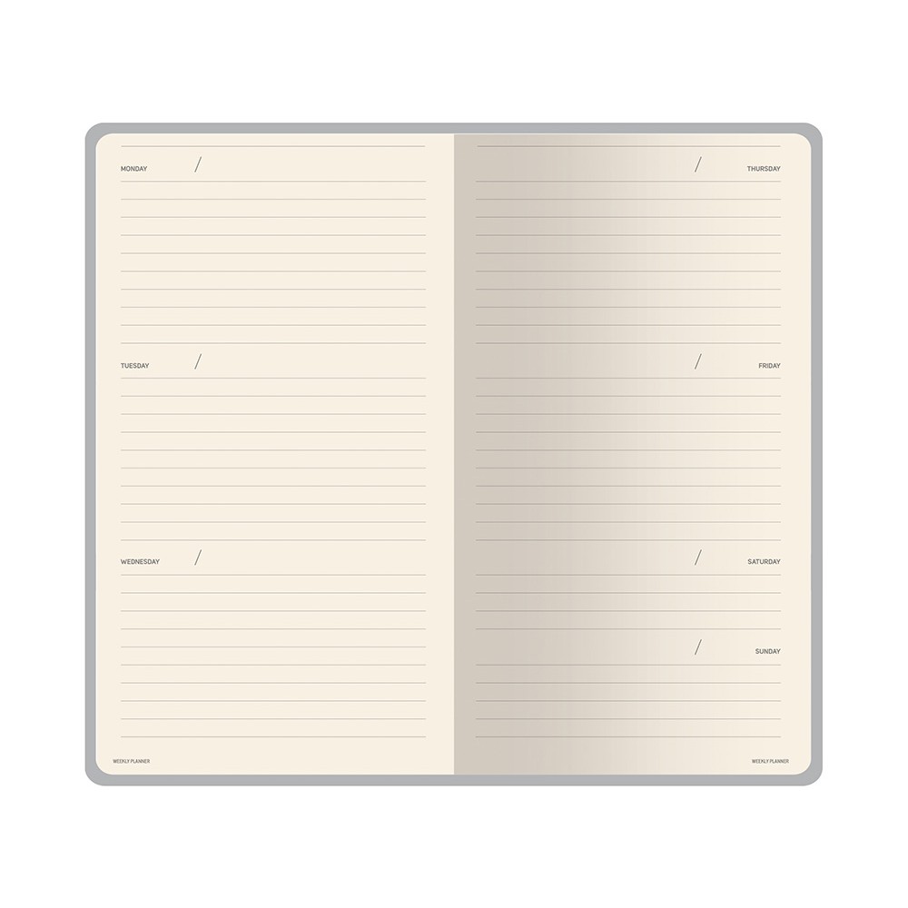 Внутри — недатированный блок формата А6 (84×160 мм) на бежевой бумаге 80 г/м². Книжный переплёт хорошо раскрывается, а скруглённые углы одновременно придают еженедельнику премиальный вид и защищают края при носке. Ляссе‑закладка выполнена в цвет обложки и помогает быстро находить нужную страницу.
