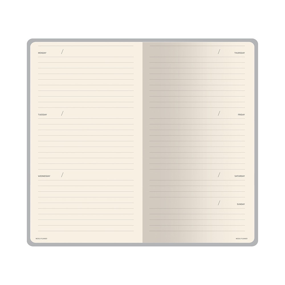 Внутри — недатированный блок формата А6 (84×160 мм) на бежевой бумаге 80 г/м². Книжный переплёт хорошо раскрывается, а скруглённые углы одновременно придают еженедельнику премиальный вид и защищают края при носке. Ляссе‑закладка выполнена в цвет обложки и помогает быстро находить нужную страницу.