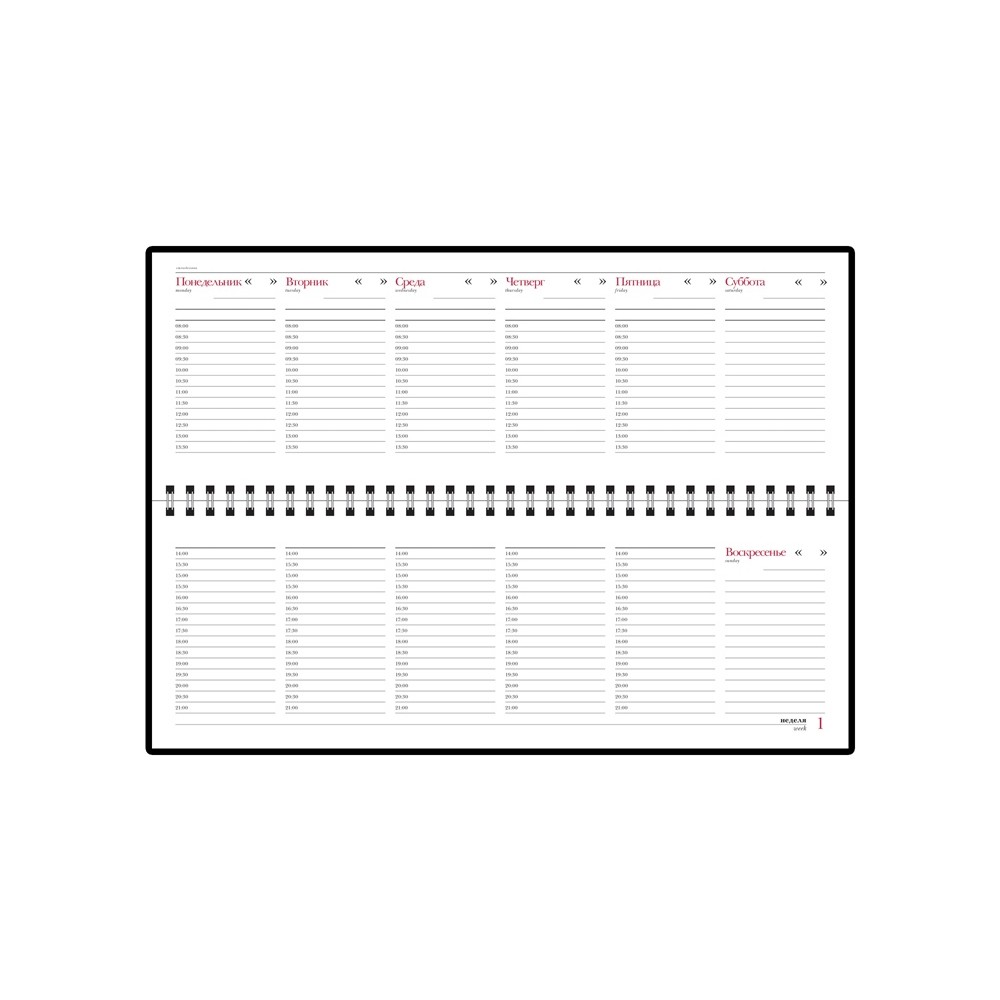Недатированный планинг на гребне, цвет бордовый, твердый переплет, 128 страниц. Плотность бумаги 70 грамм высшего сорта. Печать в 2 краски.