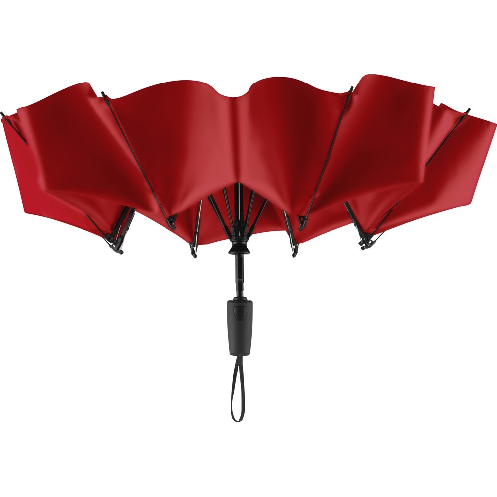 Современный зонт-полуавтомат с обратным сложением внутрь. Очень удобен в использовании, например, во время посадки в машину при складывании зонта вода остается внутри купола. Открывается с помощью кнопки на ручке из мягкого пластика.