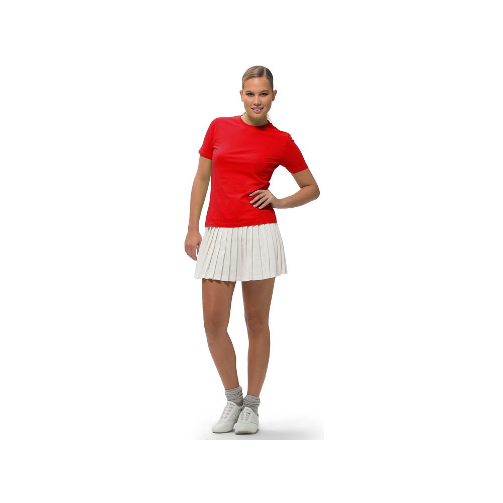Женская футболка с короткими рукавами Ace. Модель стандартной посадки. Женская и детская модели - со швами по бокам. Резинка с эластаном и двойной строчкой на воротнике. Лента от плеча к плечу. Однослойная джерси, 100% хлопок. 150 г/м².
